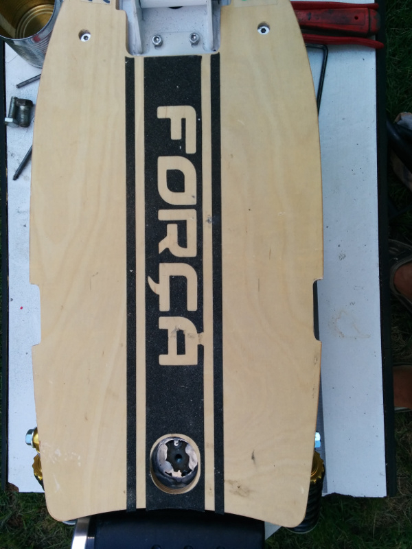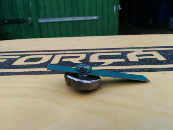 M8 ist die Originalschraube die ich gleich mitbestellt hatte.Ein Blech half mir die Mutter zu halten um sie einzuschweißen . Unter dem Blech ist eine Unterlegscheibe ,damit die Mutter etwas unterhalb des Rands sitzt. Der Tritt wurde ausgefräst bzw. mit einer Stichsäge bearbeitet. Bei mir ist kein Schlitz entstanden,denn das Brett ist wohl schmaler als bei EVO 3.0 .Ich hätte gern mal das Breitenmaß. Die beiden Haltezapfen sind Rundmaterial 10mm Durchmesser x 30mm lang.