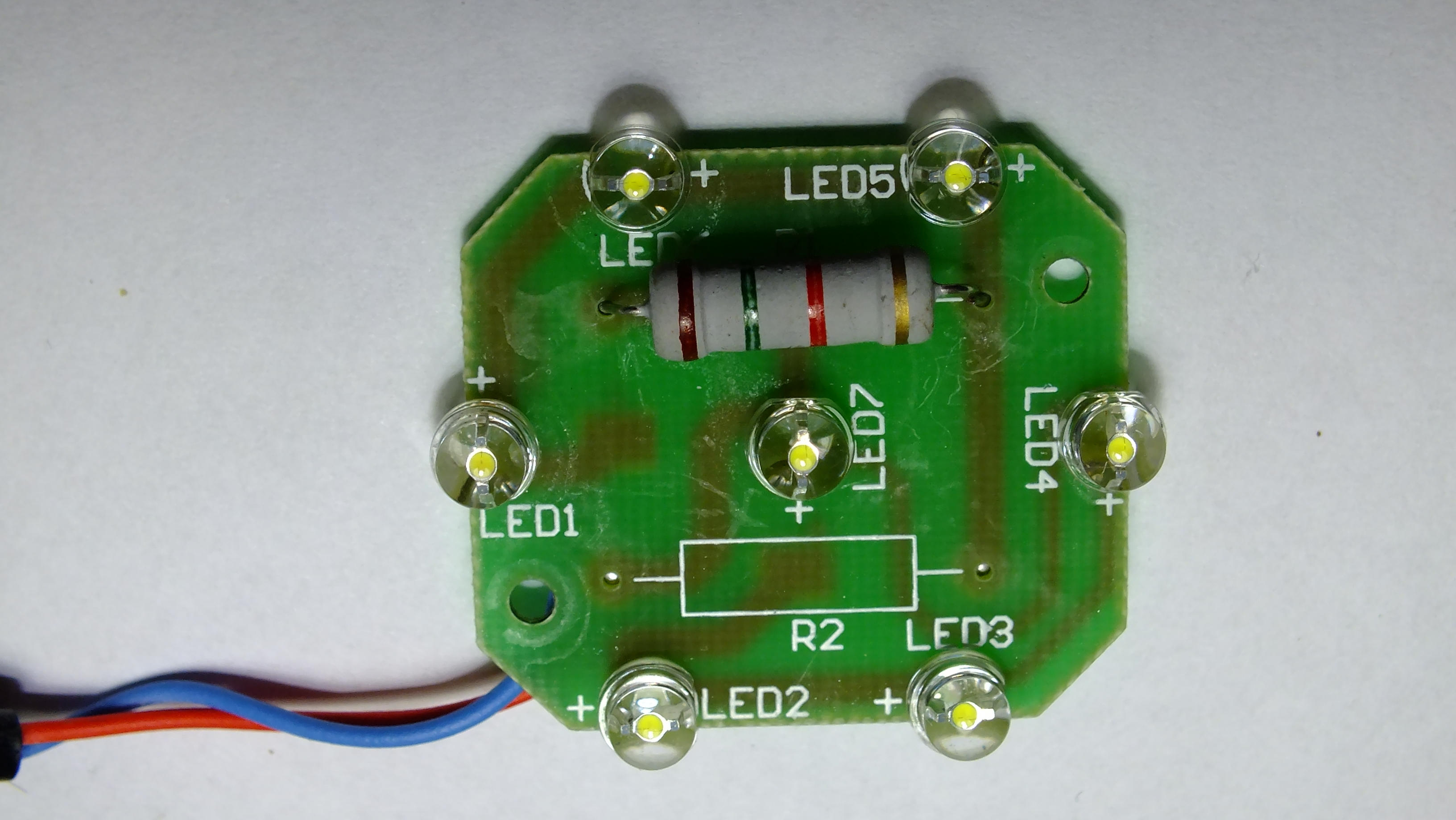 Demontiert man diese Lampe, findet man eine Leiterplatte mit sieben LED und einen Widerstand. Versuche hier irgendwo eine Brücke rein zu bringen oder den Widerstand ausser Betrieb zu setzen, aufzutrennen oder sonst was, sind bei mir gescheitert. Ich habe die Lampe nur mit 48 V zum Leuchten gebracht...