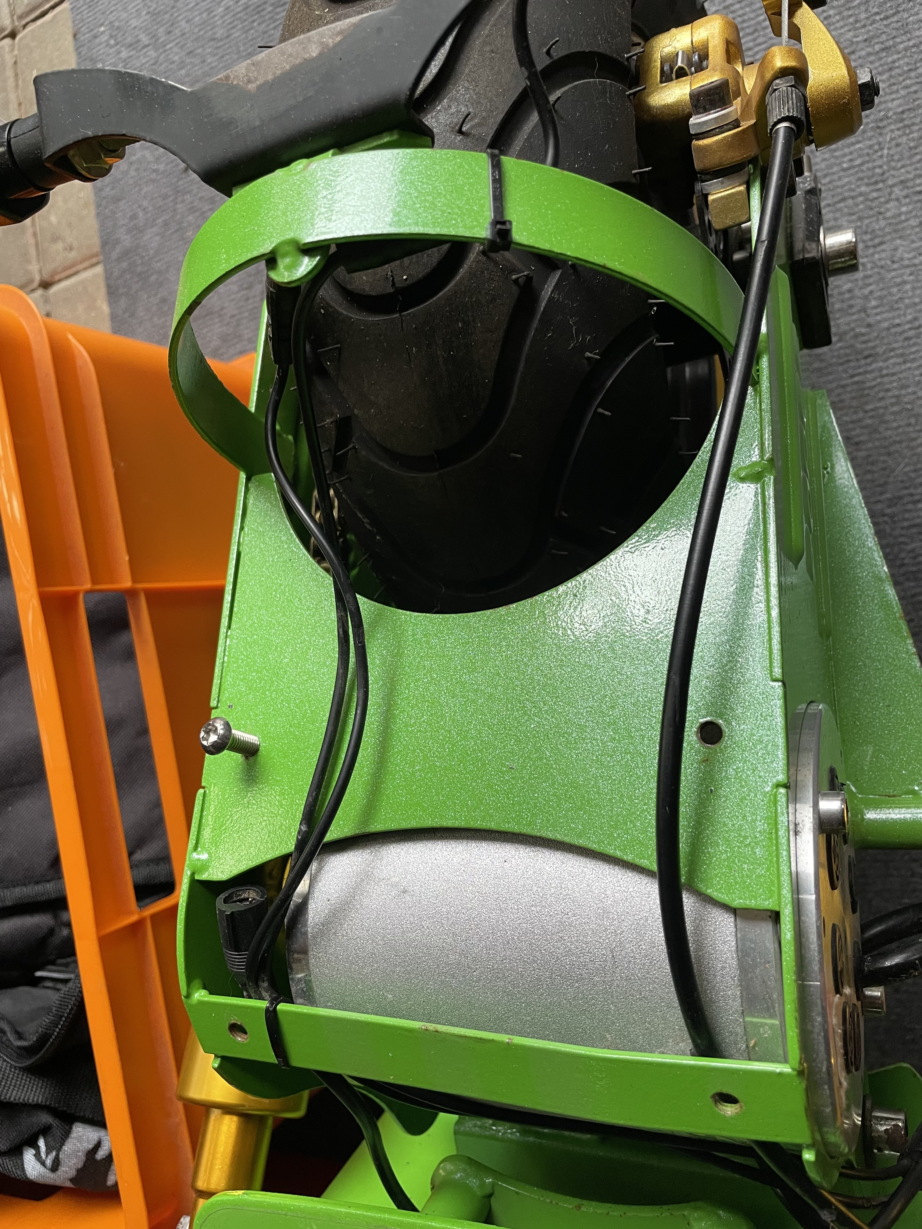 Z.B. die schwarze Kunststoff-Abdeckung über dem Hinterrad.