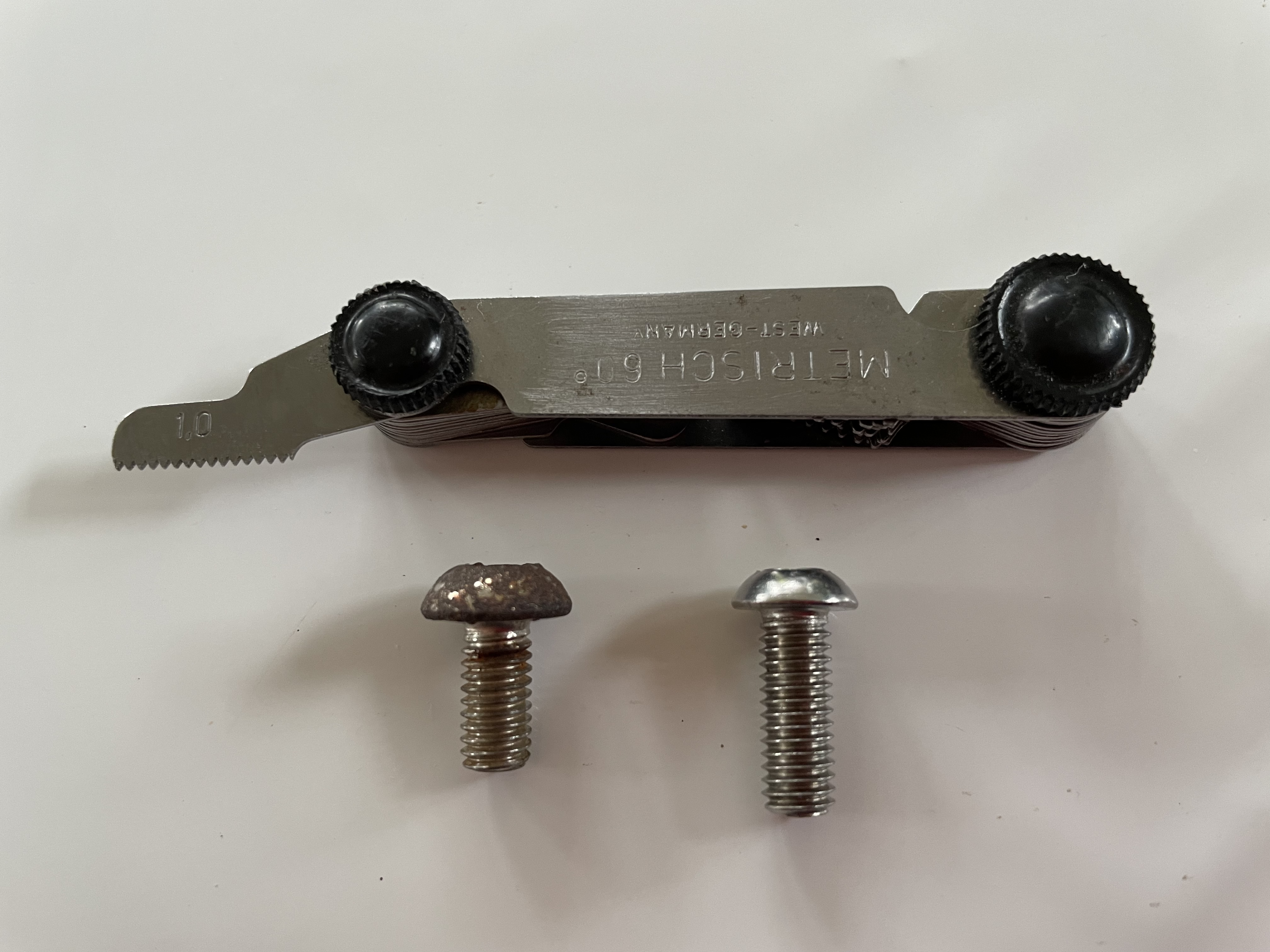 Beide Schrauben, alt verrostet, neu Edelstahl, haben ein M6x1,0 Gewinde.