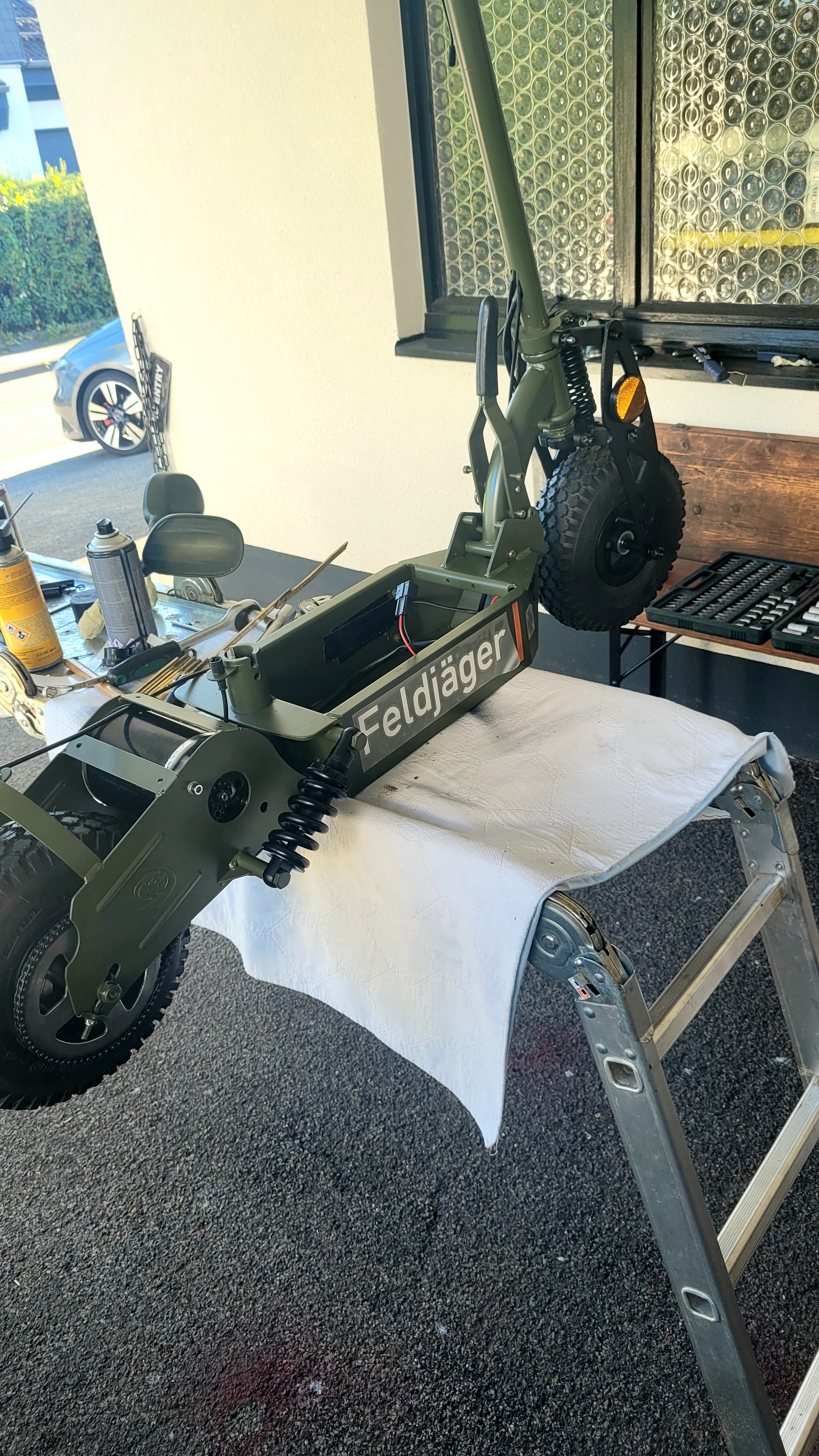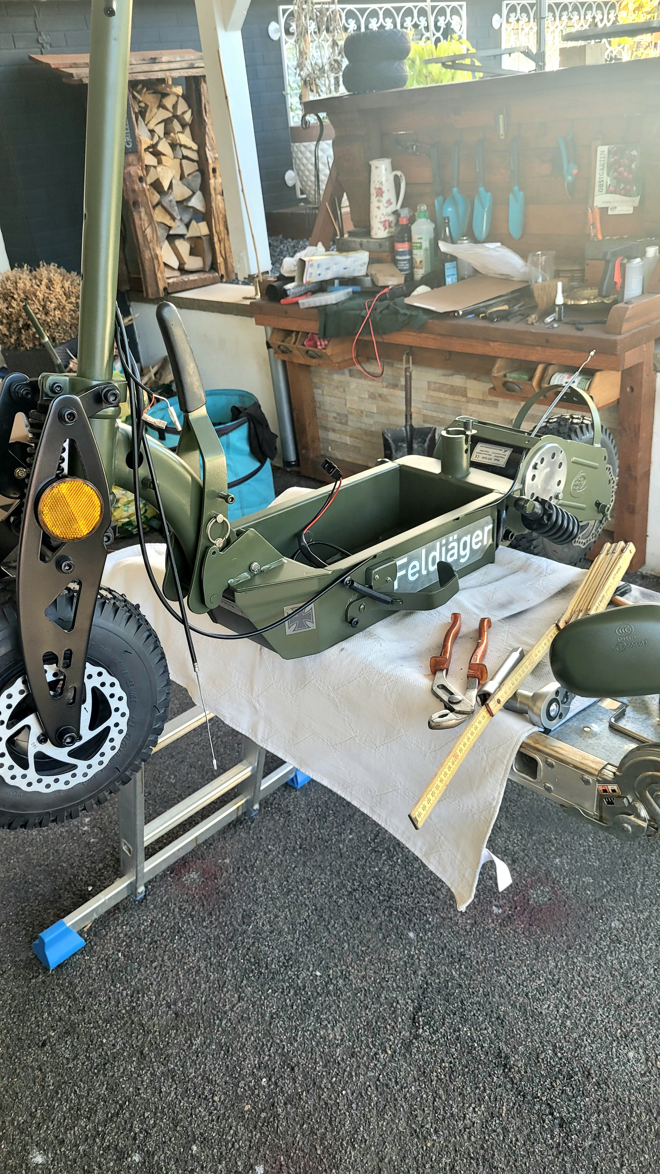 Egal, ich habe das Teil komplett auseinander geschraubt und ein kleines, lustiges Bundeswehr Rollerchen kreiert.