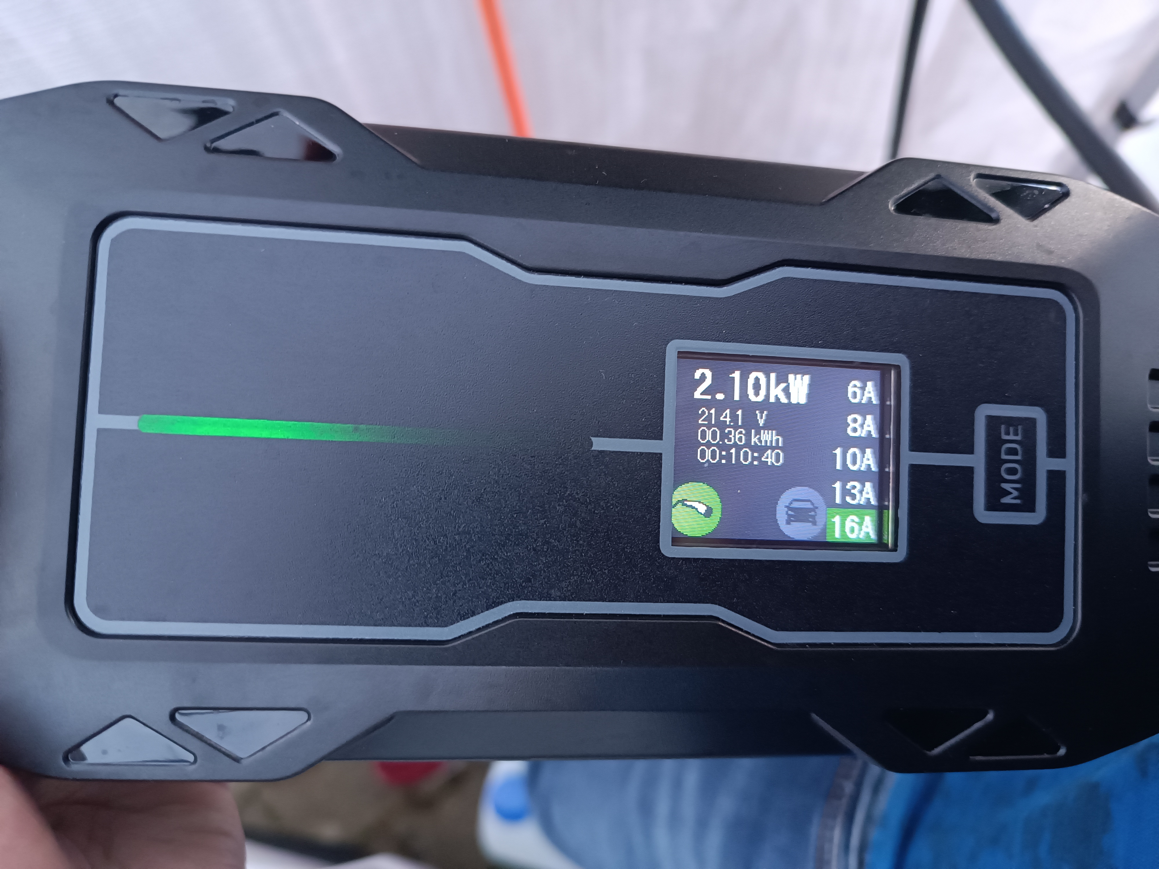 Nun, die 6/8/10/13/16A Vorwahl gibt den max. vorgewählten Strom für die 230V Seite vor. Wenn das LG mit max. 25A laden kann bei 84V entspräche das einer Ladeleistung von 25A * 84V = 2,1kW. Bei 84V werden aber nicht mehr die 25A fliessen. Die max. 2,3kW fliessen ab Steckdose (230V). Das Ladegerät wird einen Wirkungsgrad von 85% haben - beim Laden erwärmt es sich.