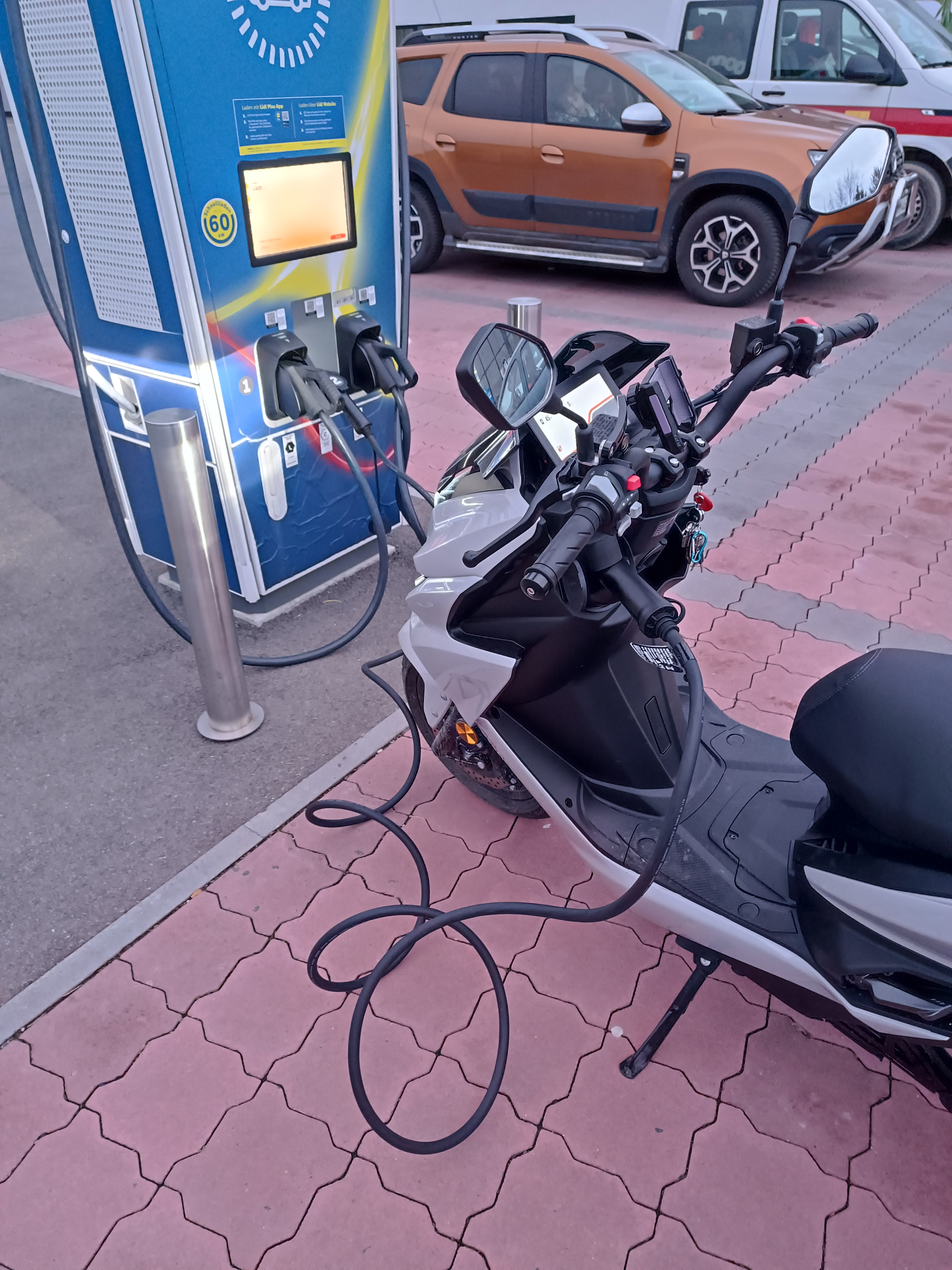 Der Roller kann in ca. 4.5h an einer Haushaltssteckdose geladen werden. Das Kabel (230V auf Typ2) liegt bei - sieht man auf einem der Fotos weiter oben.