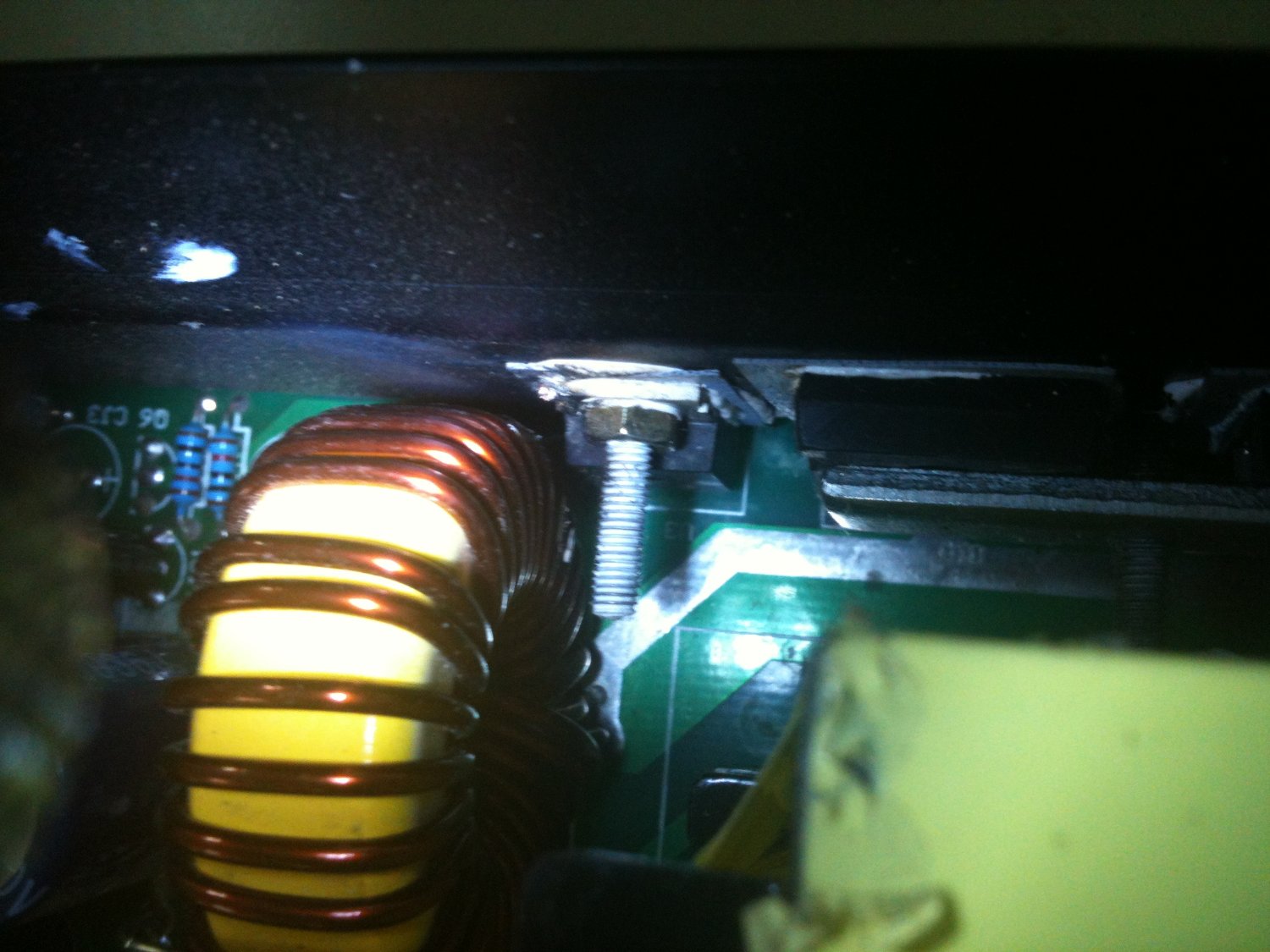 Ich denke mal, die Spule ist gegen das Gehäuse gerutscht, es gab einen Masseschluß (sollte eigentlich nicht sein, im Idealfall ist das Metallgehäuse potentialfrei!), und dann gab das schwächste Glied = die Leitbahn nach, hoffentlich vor allen anderen Bauteilen. Die sieht von unten etwas angeglüht aus ...