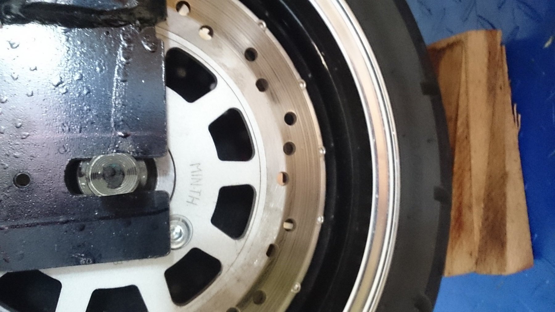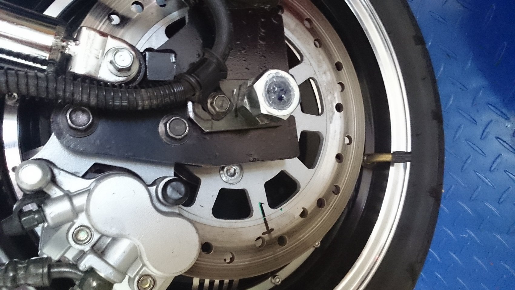 An der Drehmomentstütze habe ich etwas an der Ecke weg. Der Edding ist jetzt der innere Rand des Belages.