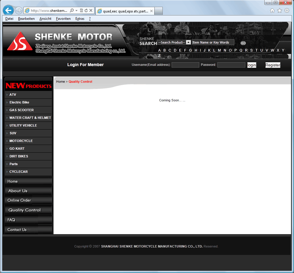 Dann kuck mal unter diesem Link, was Du siehst. Das hat mit Wartung nichts zu tun, die Seite wurde wohl schlicht noch nicht erstellt. Und bei einem bin ich ÜBERHAUPT NICHT tolerant: Wenn ich für viel Geld ein Fahrzeug kaufe ERWARTE ich, dass zumindest eine gescheite Endkontrolle schon beim Hersteller durchgeführt wurde, "Quality Control" eben, und wenn ein so großer Laden wie Shenke nur ein "coming soon..." für das Thema übrig hat macht mich das doch sehr nachdenklich.Elbkieker hat geschrieben:Ich dachte eigentlich, dass wir toleranter sind als die Mainstreamer....Schade dem ist nicht so!!!! Bei mir funktioniert die Seite einwandfrei und wenn mal Wartungsarbeiten ausgeführt werden sollten, dann passiert das auch bei deutschen Seiten. Siehe http://elektro-mobil-center.com/about.html ganz unten. Ihr enttäuscht mich...