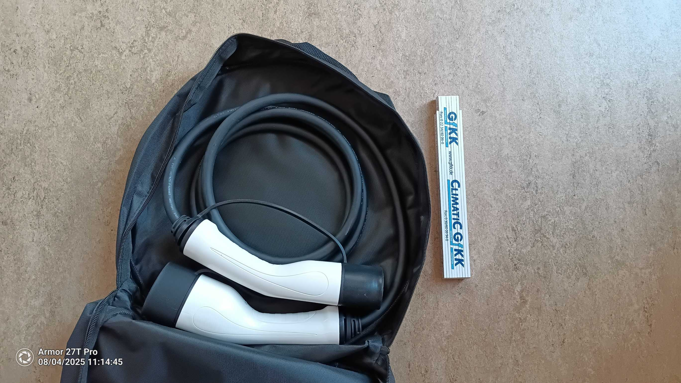 Ich hatte mir nach dem Kauf der Pro zudem ein oranges 5m Kabel mit 2 weißen Typ2 Steckern im Angebot bei Amazon gekauft. In meiner Garage getestet und für gut befunden. 5m Länge brauche ich wenn ich bei einem Freund in Finnentrop an seinem Häuschen laden will weil die Gartensteckdose etwas weiter vom Stellplatz weg ist. Das Kabel passt definitiv nicht in die kleinen Naxeon Packtaschen.