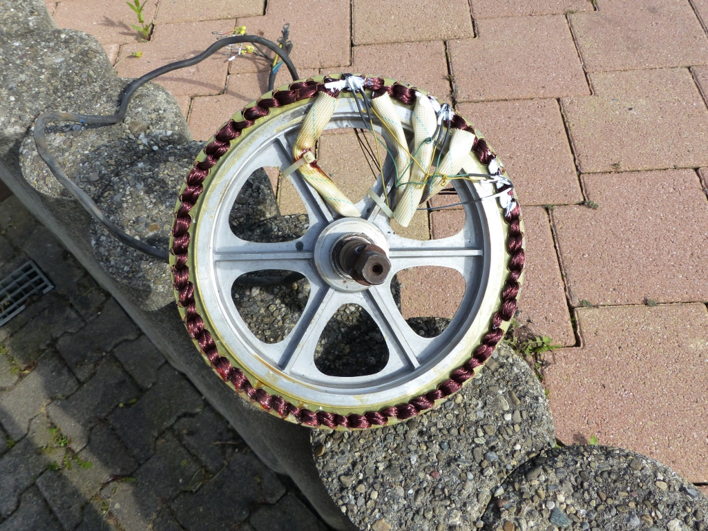 Das sind sicher 30 Lackdrähtchen pro Phase, und scheinbar nur 2,5 Windungen pro Polschuh :o Das aber mal 21 auf den Umfang verteilt, und sich abstoßend und anziehend an nicht besonders kräftigem, aber ebenfalls auf dem ganzen Umfang verteilten Magneten, erzeugt bei meinen 100A Batteriestrom beim Anfahren mal kurz 160 bis 180Nm am Reifen :mrgreen: