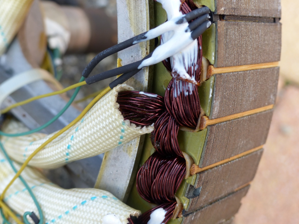Die dünnen Drähte gehen zum zweiten dreier-Satz von Hallschaltern, die drei Textilhüllen rechts im Bild verbergen die drei Phasen-Litzenbündel, und die fette Textilhülle links mit der brauen überhitzungsverfärbung verbirgt den Sternpunkt, wo alle drei Phasen-Litzenbündel zusammenkommen und miteinander leitend verbunden sind.