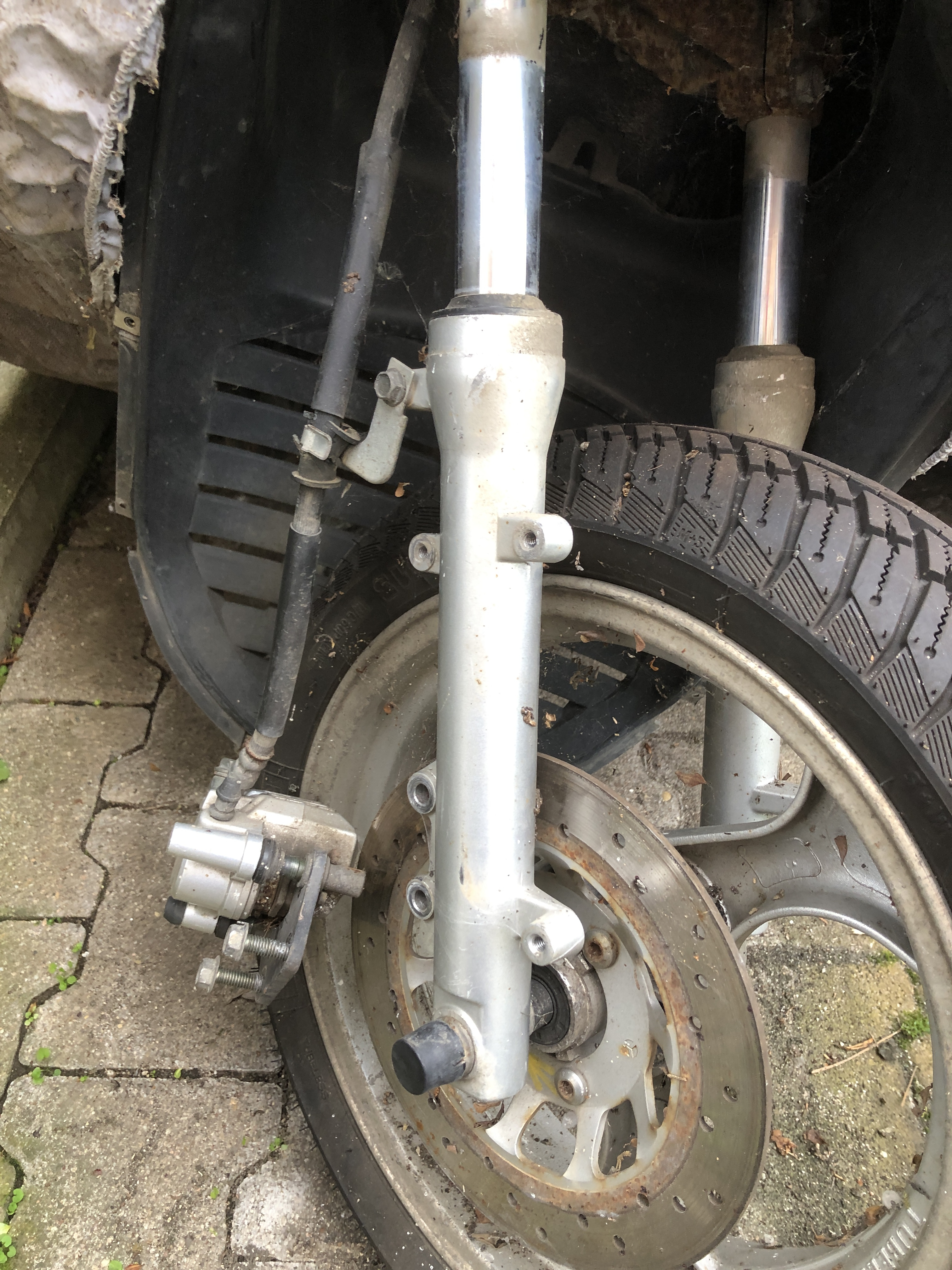 Nach meinem wüsten Unfall im Juli 2014 wurde eine "neue" Vordergabel eingebaut bei Uwe. K. in Fürth im Odenwald, die dann für weitere knapp 15000km Dienst tat in meinem E-Pferchen, bis ich es endgültig vor 4 Jahren wegen Rostbefall außer Betrieb setzten musste. Die Verchromung vom Standrohr ist noch tadelllos, doch ob das auch vom Dichtring behauptet werden kann ist fraglich.