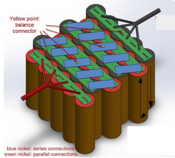 Auf dem Bild würde ich nur einmal Nickelband durchziehen und dann jeweils von Minus zum nächsten Pluspol ein Band schweißen.