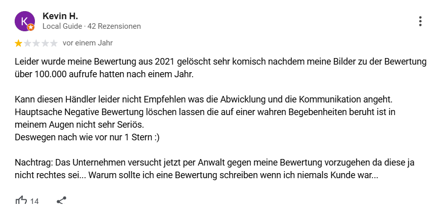 auweia.....auch du brutus?Markus Sch. hat geschrieben: ↑Do 27. Mär 2025, 13:58e-drive center Bewertungen scheint das Unternehmen negative Bewertungen zu löschen.