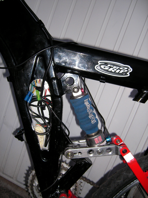 So--! nun zeige ich euch nicht das schnellste , aber ein ,( wie ich finde) sehr geiles Bike in seiner 1. Erstellungsphase! Das Bike hat natürlich ein Daumengas UND einen Tretsensor! Die ganze Kabellasche kommt in den Alurahmen wie man sieht. Forn ist schon die Hydraulische 4 Kolbenbremse von Gator angebracht. Der Controller mit 36 Volt 22 A ist auch schon an seinem Platz! Ein Schalter zum Einschalten des Controllers und des weiteren zum schalten der Leistungsbegrenzung auf 12 A ist auch schon am Lenker! Als Akku werde ich einen