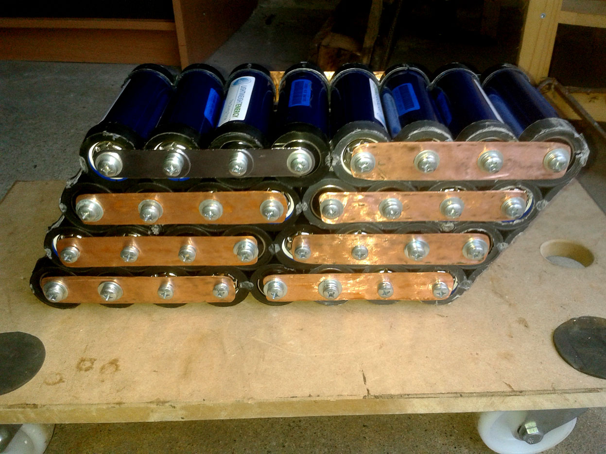 Nee Neeeee! Die andere Seite sieht anders aus. Es sind immer 2 Zellen parallel. Die Viererbrücke (selbst aus Kupferrohr gebaut)verbindet den plus sowie den Minus Pol von jeweils 2 parallelgeschalteten Zellen. Muss man schon etwas aufpassen, sonst haste du einen schönen Lichtbogen