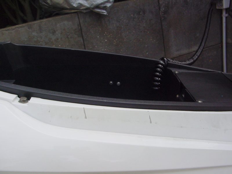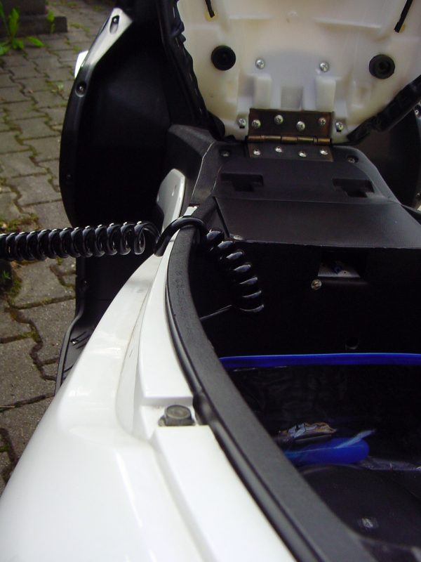 Das Ergebnis sieht dann aus der Nähe so aus: Der einzige Nachteil dieser Lösung ist, dass auf der gegenüberliegenden Seite zwei Verstärkungsrippen der Sitzbank den Lack am Helmfachrand ankratzen: