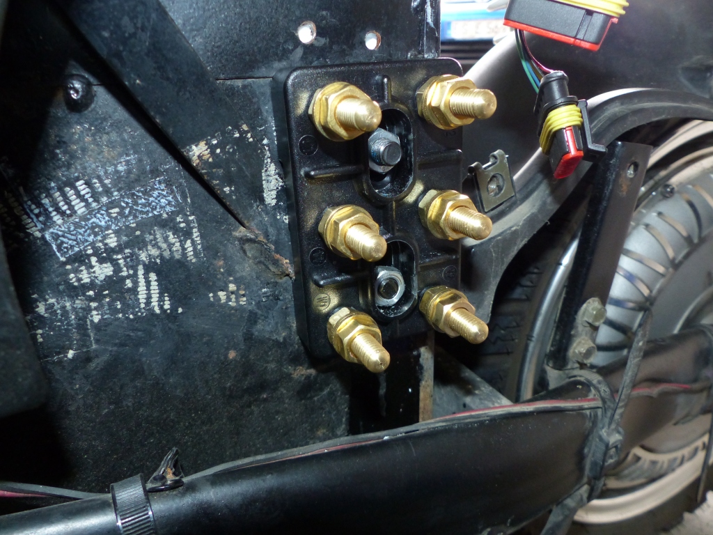 Unten ist noch genug Feiraum für eine Volleinfederung der Hinterradschwinge, zumindest habe ich auch bei wilden Hüpfeskapaden auf dem Roller keinen Kontakt zwischen Schwinge und Motor-Klemmbrett feststellen können...