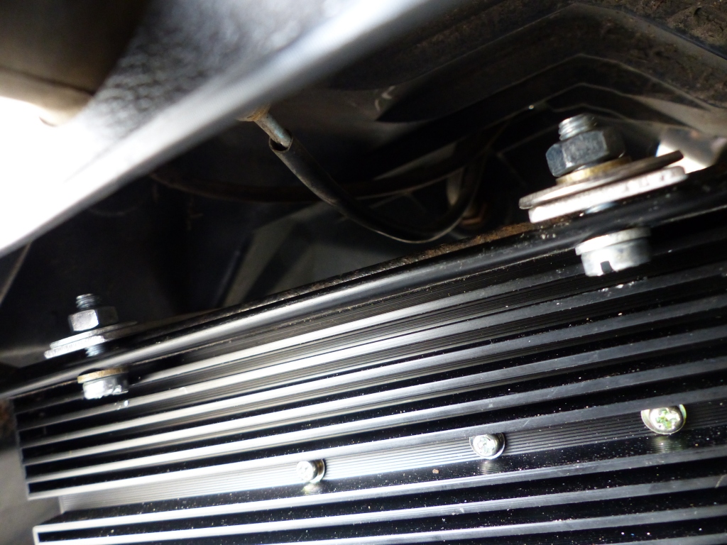 Am geplanten Einbauort des Motorklemmbretts, seitlich hinten an der Seitenwand vom Batteriefach, ist ein Haltebügel für das Batteriefach festgeschweißt. In diesem Bild sind schon die zwei Ø8,5 Löcher gebohrt und mit drei Schichten Brunox bedacht: