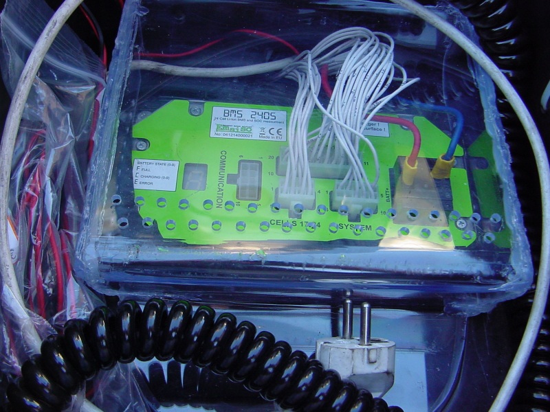 ganz unten in Bildmitte sieht man schwarz verrippt den DC-DC-Wandler 72V/13,5V vom on-board "Heizkraftwerk", der bei Bedarf von der fetten schwarzen Zwillingslitze aus dem Sicherungsfenster mit Batteriesaft gespeist wird. Der DC-DC-Wandler steht jetzt eben auf der BMS-Haube.