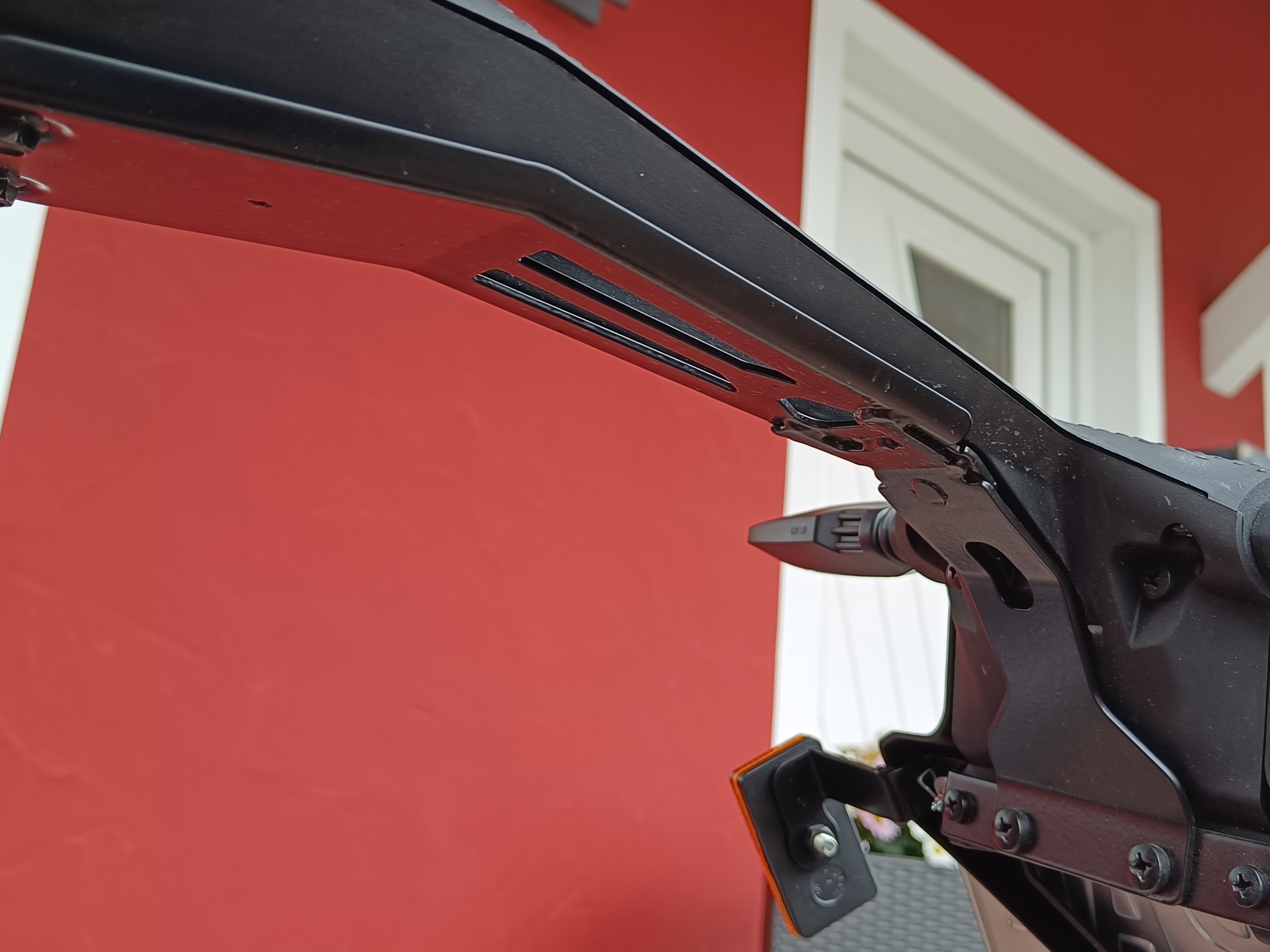 ++ Wie im Beitrag darüber auch schon erwähnt wurde, sind mir ebenfalls in diversen Videos der Kennzeichenhalter negativ aufgefallen. Da war ich total überrascht, der wurde meines Erachtens definitiv überarbeitet. Die Kunststoffunterseite ist mit mehreren Metallplatten verstärkt worden (siehe Bild). Da wackelt gar nix mehr.