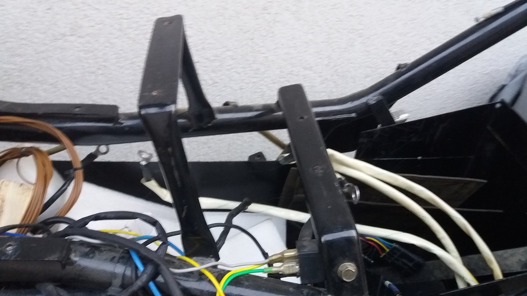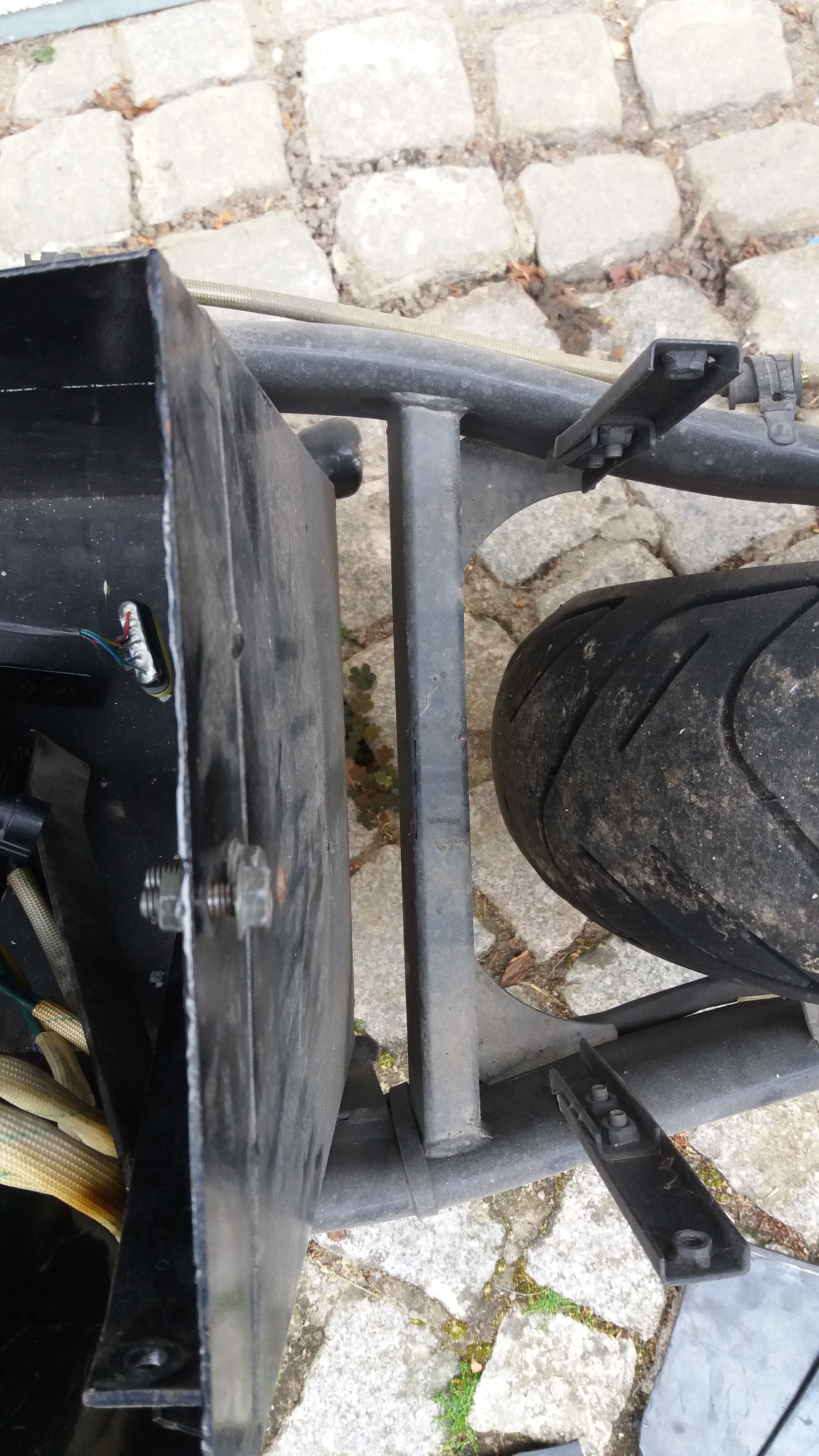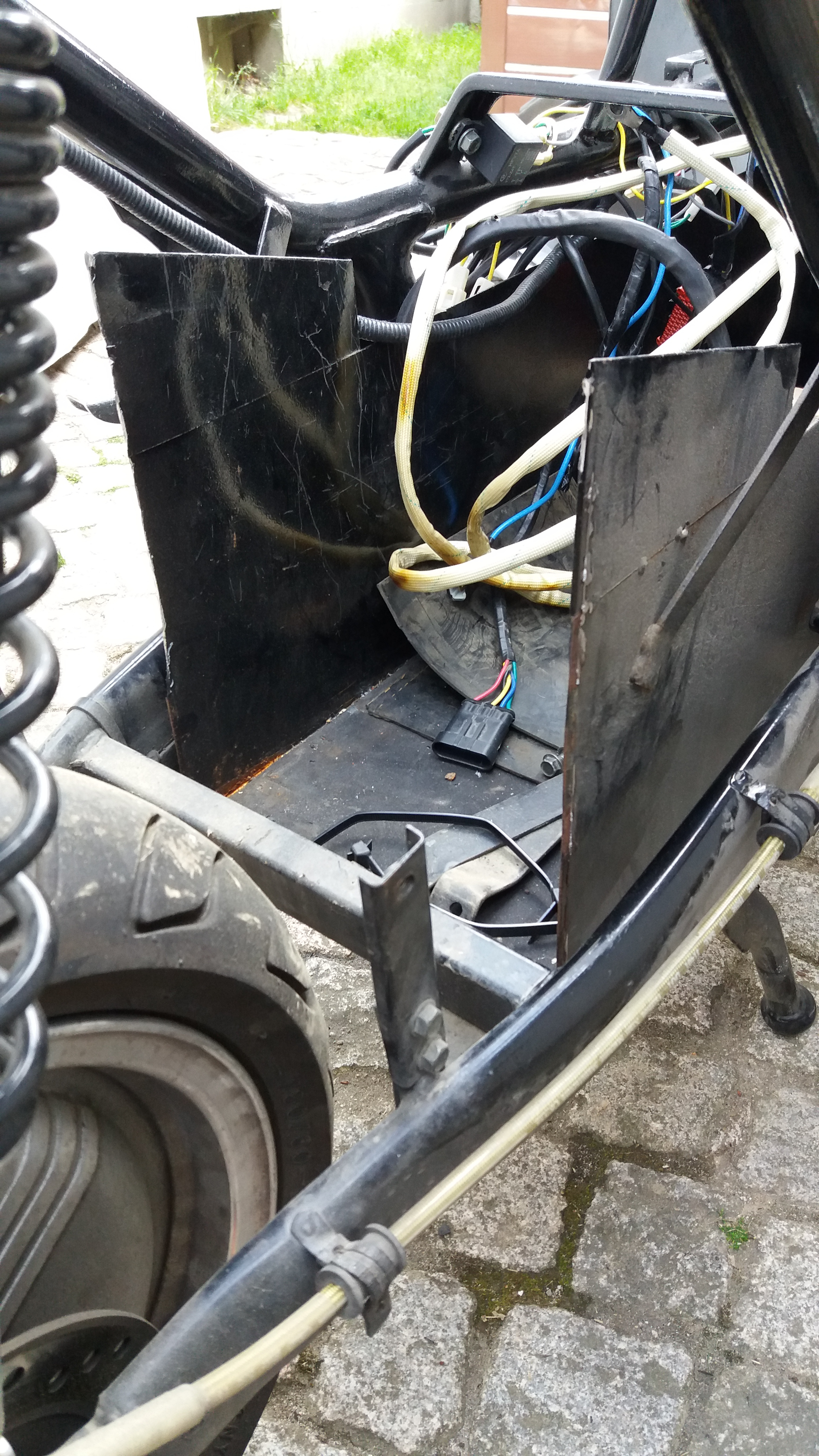 Das Fach steht vorne links unten schon am Rahmen an. Rechts ist noch 10mm Luft. Chinesen halt. Hinten ist auch kaum mehr Platz zu gewinnen. Da ist die Strebe der Schwinge im weg und der Spritzschutz. Ich könnte das unnütze Fach für die Starterbatterie und die Abstützung dafür raus schneiden.