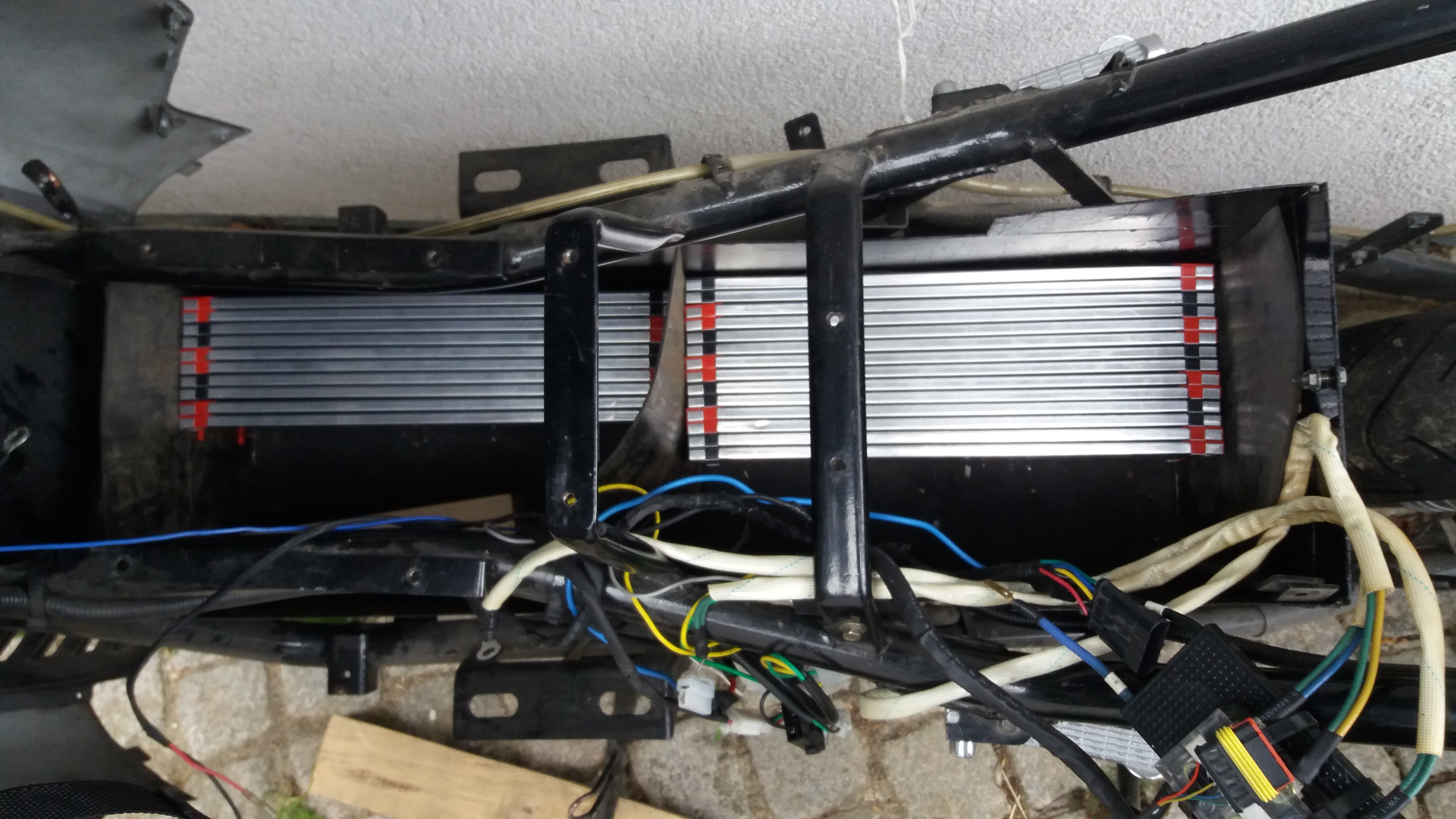 Extremo sollte original mit 24 Stück 60Ah LiFePO4 ausgestattet gewesen sein. Geht nur in quer dreier-packs unten rein, der Rest liegend oben drauf. Ladegerät dabei im Helmfach liegend.