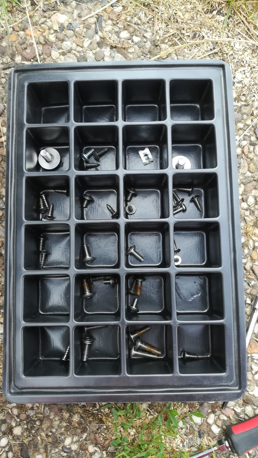 Der Zerlegeanleitung folgend habe ich auch die Schrauben schön in Fächerchen abgelegt, weil ich beim letzten Zusammenbau viel Zeit damit zugebracht hatte, mir zu überlegen, welche wohl wohin kommen sollten. Ich denke, das wird diesmal schneller gehen.