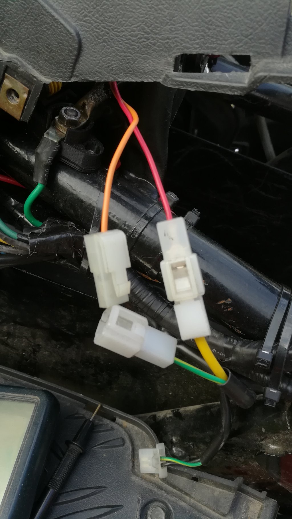In der Nähe liegt aber auch noch ein weisses Kabel mit passender Kupplung, ich denke, das war für den Anlasser, und eine meiner Überlegungen war ja, den Anlasserknopf für regeneratives Bremsen zu benutzen... Ich hab nur noch nicht gefunden, welche Kabel oben zum Anlasserknopf gehören... Weiss das jemand?