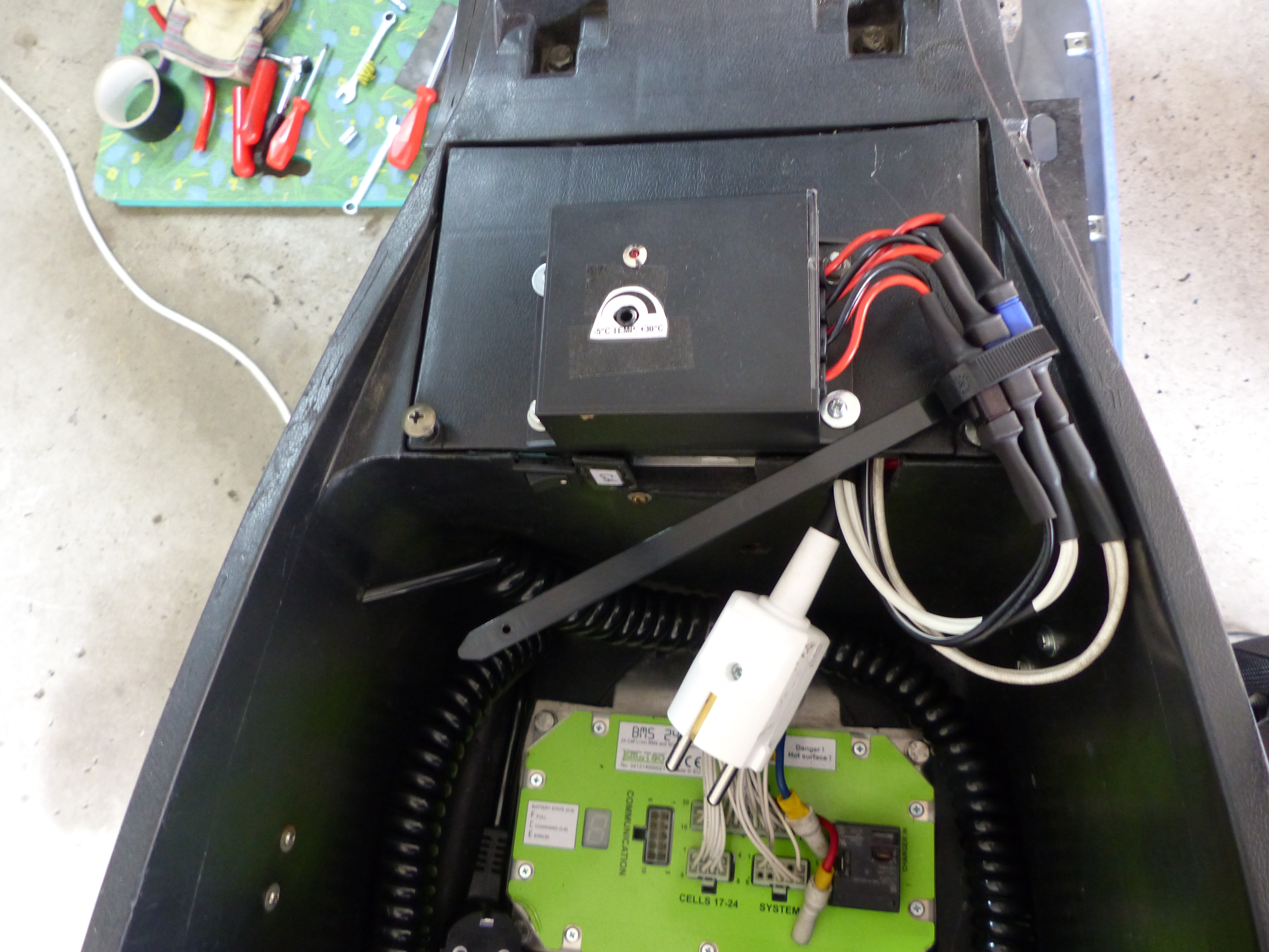 Oben auf dem Deckel des "12V Batteriefachs" tronte mein aus einem Conrad-Bausatz gebauter 12V Temperaturregler: Einstellung per Schraubendreher, rote LED zeigte Heizbetrieb an. Der kurze Netzstecker war für die netzbetriebene Heizungssparte. Das Emsiso BMS am Boden des "Helm"fachs (meiner ging da nie rein...) wollte ich schlicht im Blick haben, da eine Digitalanzeige dessen Gemütszustand preisgab. Es war vorher von außen nicht einsehbar UNTER dem Blech, AUF dem es im Bild tronte, was ziemlich sinnlos war. So nahm aber die notwendige Plexiglashaube darüber ein wenig des Helmfachs weg, aber kaum mehr, als es der vorherige blödsinnige Buckel-Deckel da unten tat.