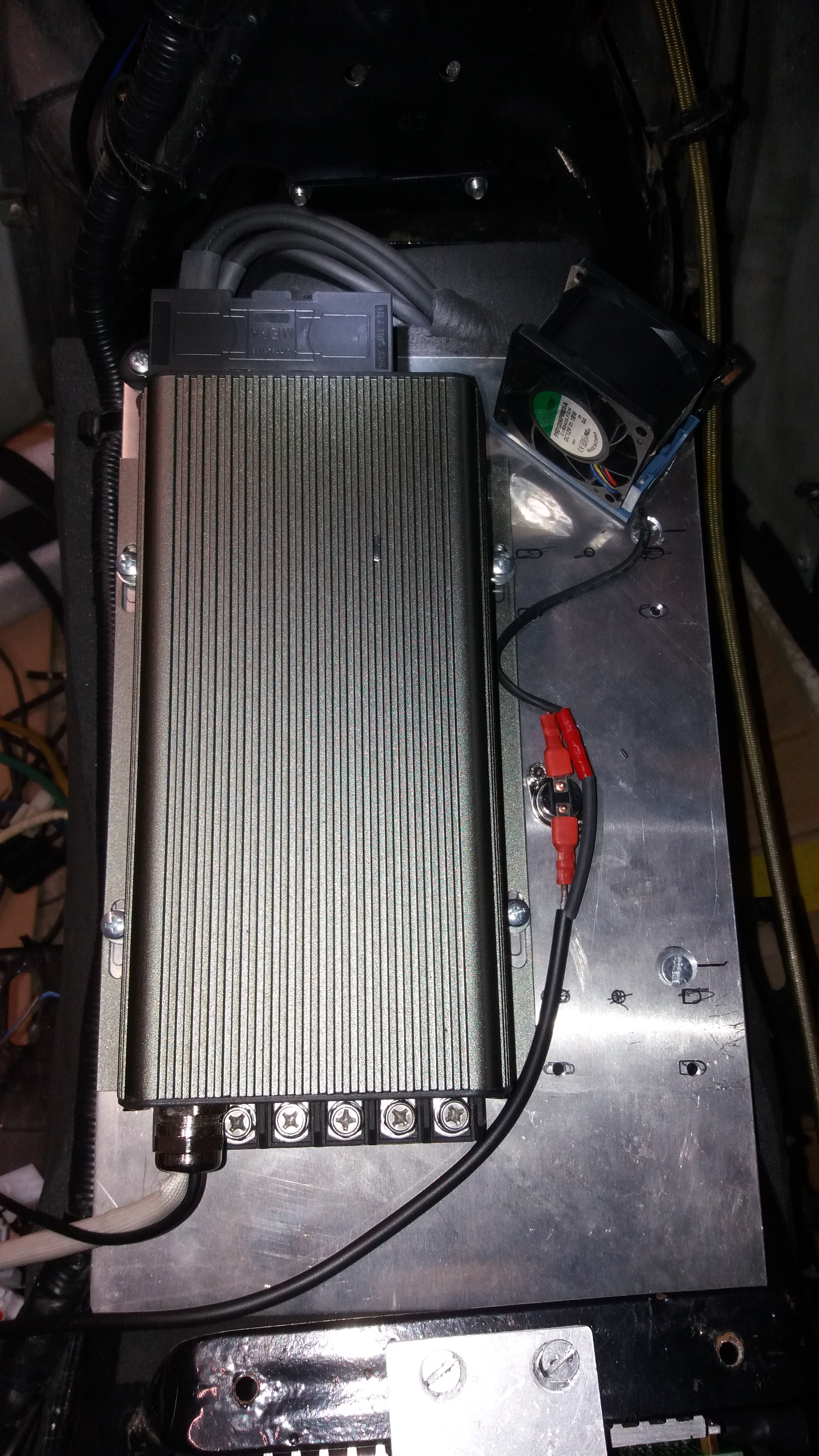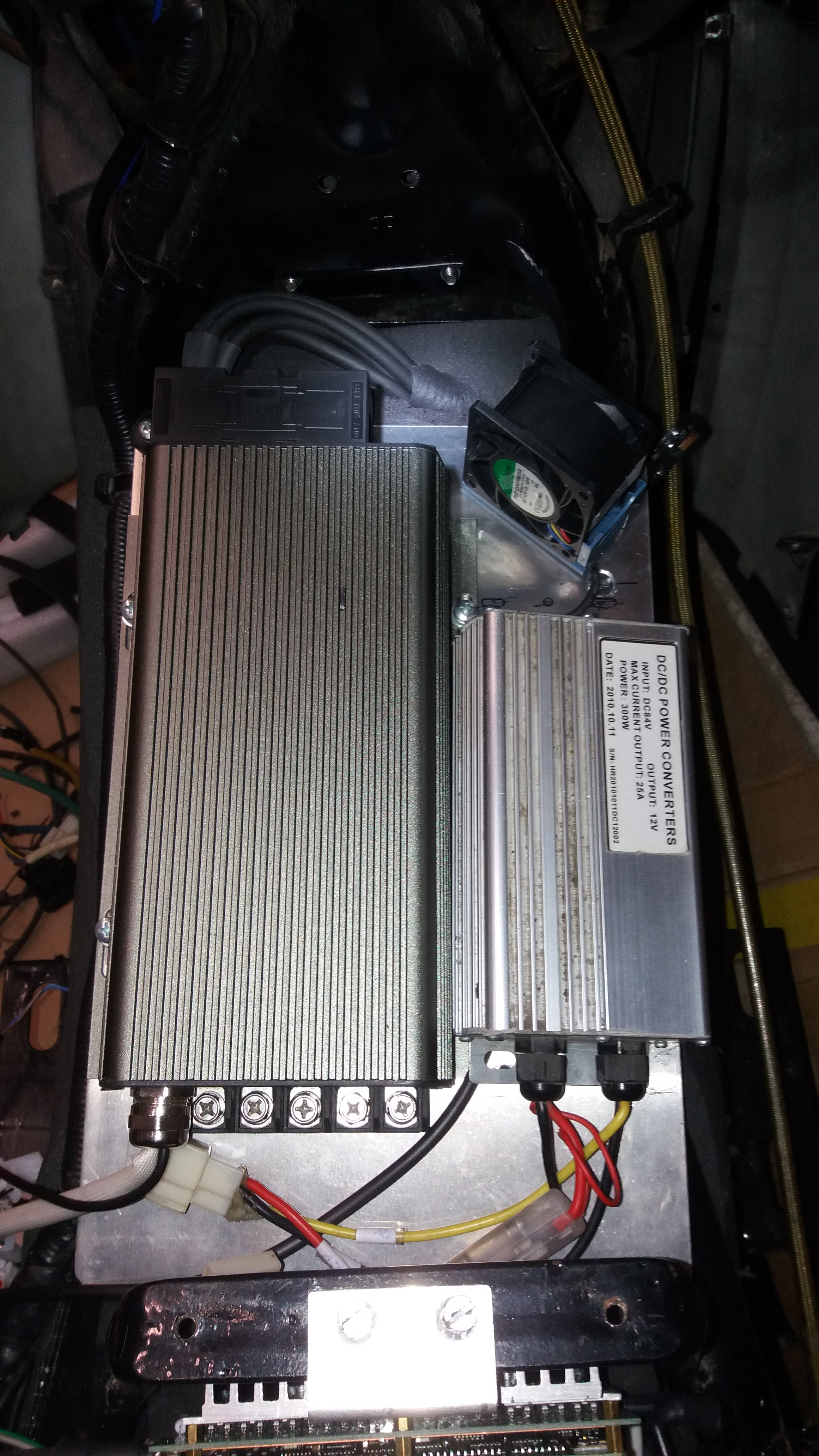 Der DCDC saß beim alten Roller in der den Lampenmaske, der war ringsum nur von Plastik umgeben. Es ist ein 84V/12V 25A Modell, so viel Strom wird er wohl nie brauchen.