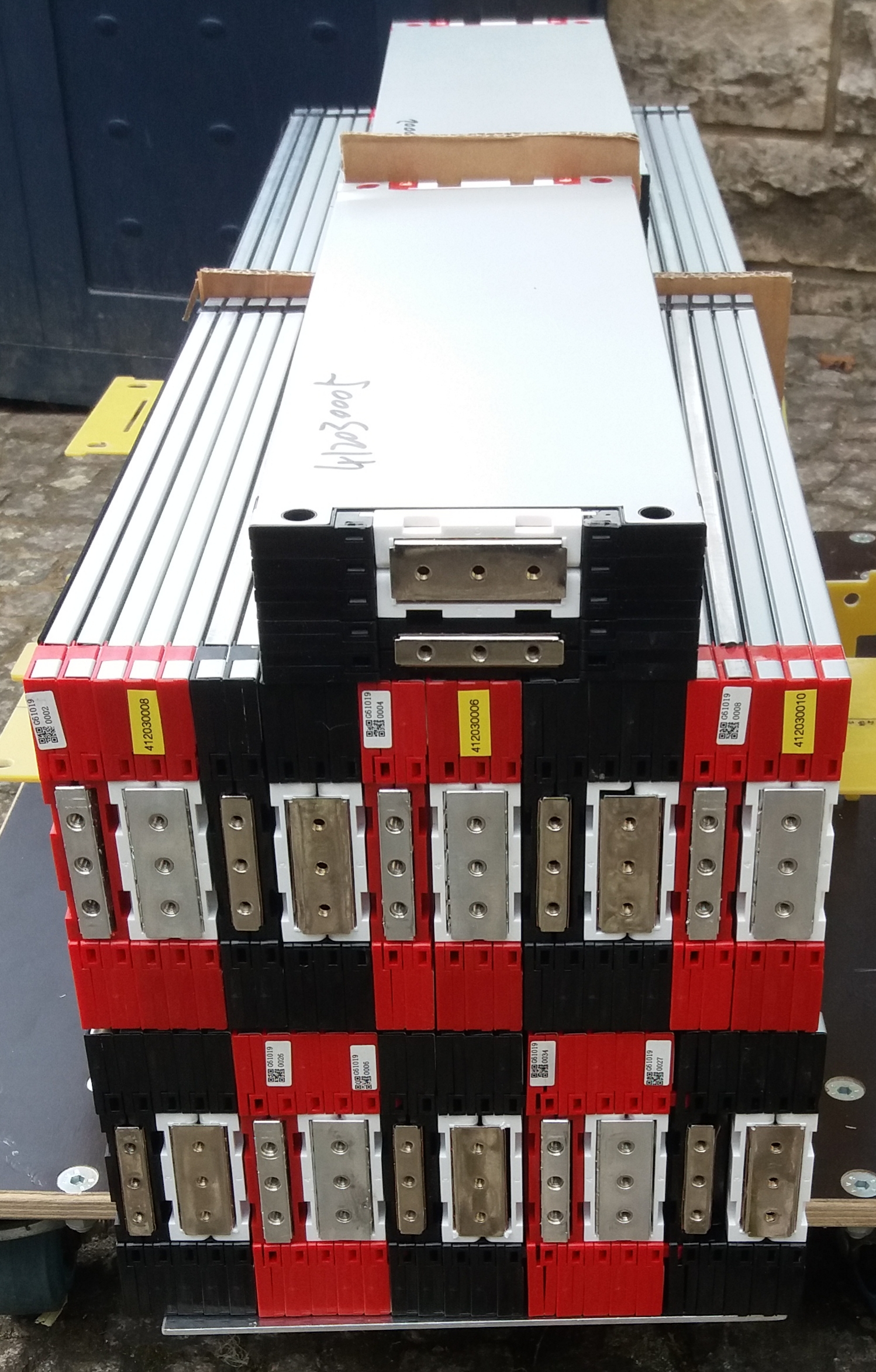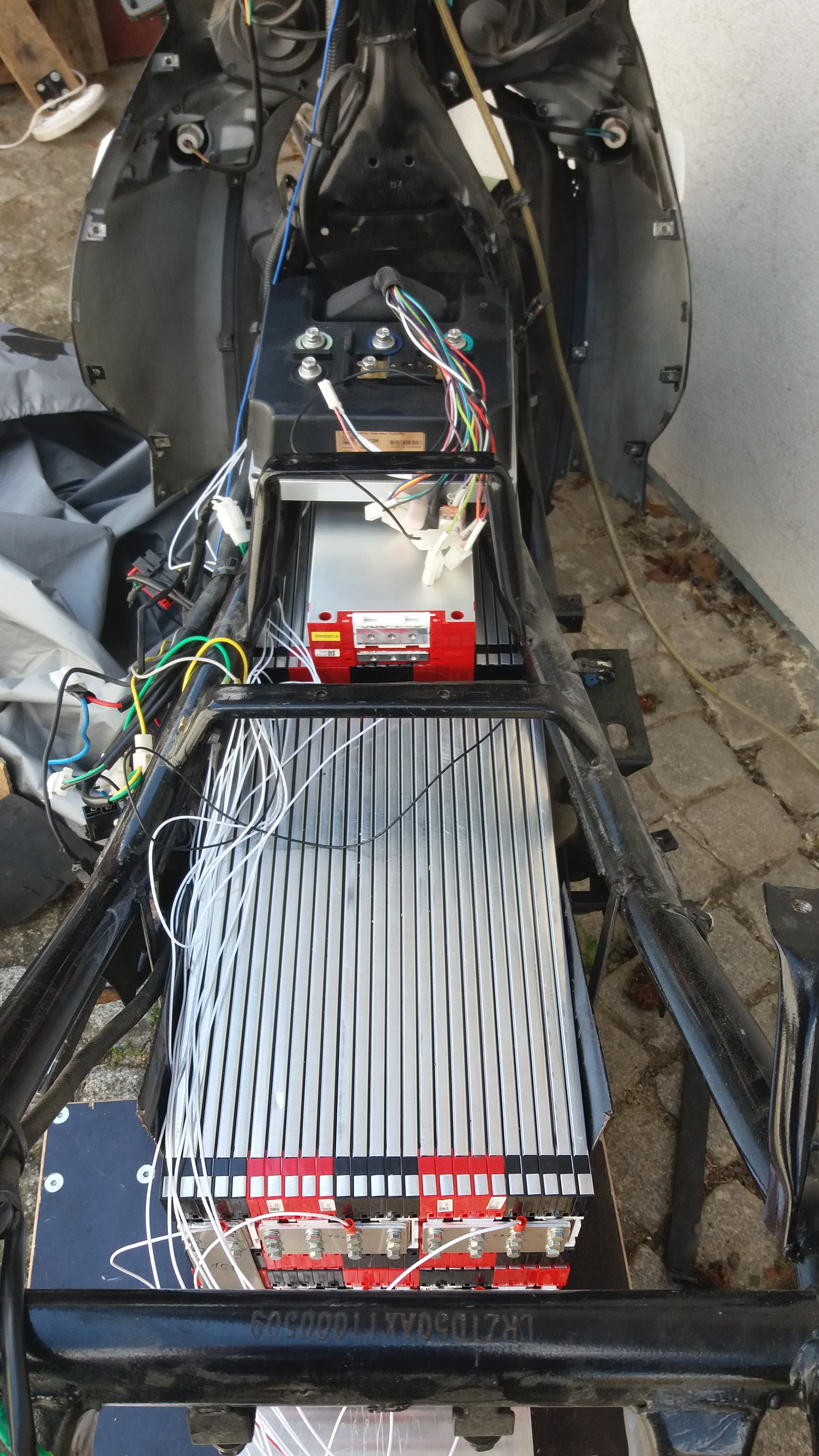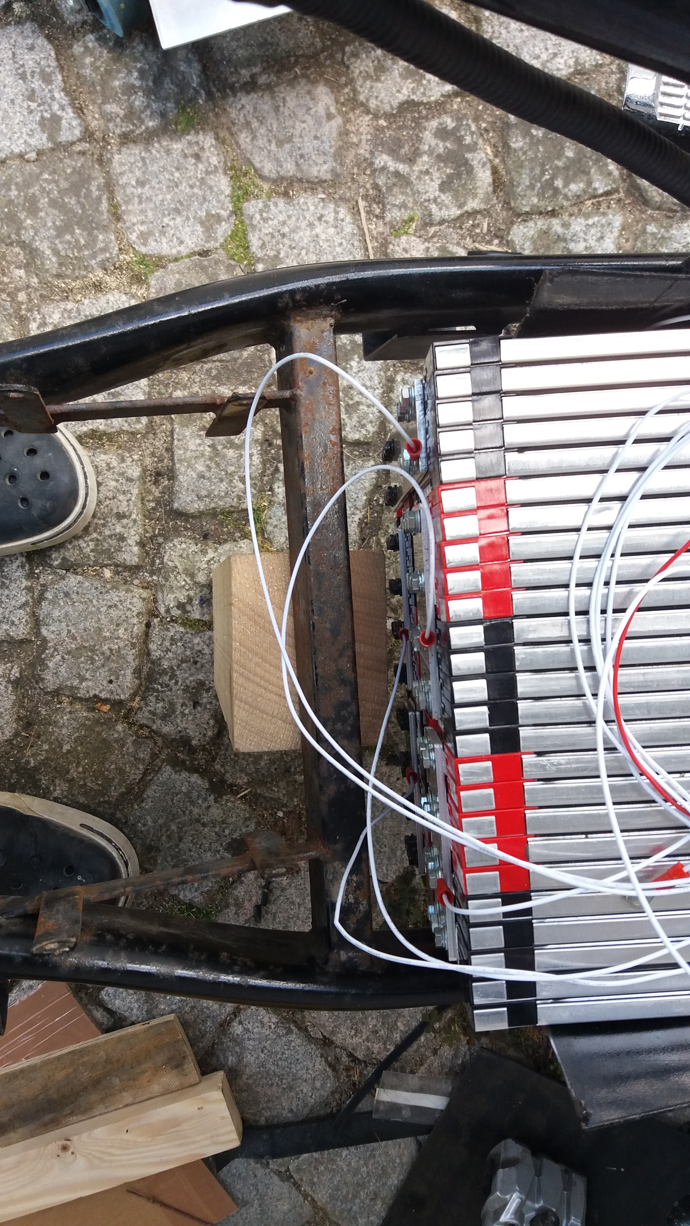 Meine Idee den ganzen Akku auf einer dicken Alu-Platte in den Roller zu schieben musste ich wegen zu wenig Muskelmasse aufgeben. Habe dann erst den vorderen Stapel eingeschoben und den Rest dann hinterher. Der ganze Stapel Seitenansicht mit MQN-Controler und Sitzbank und