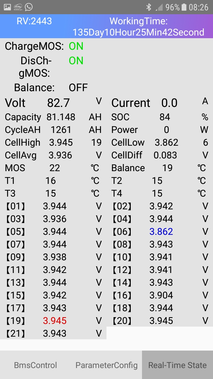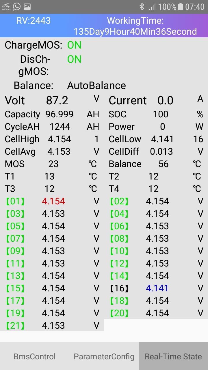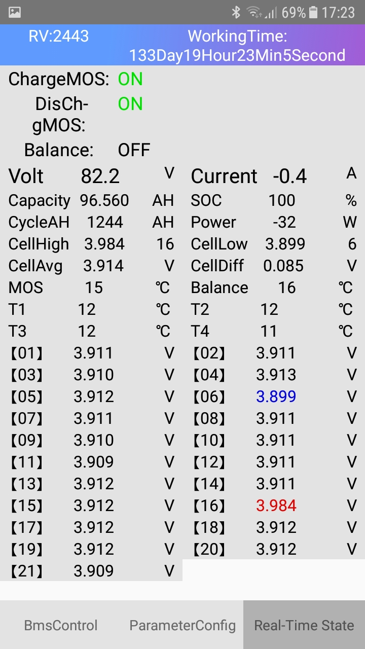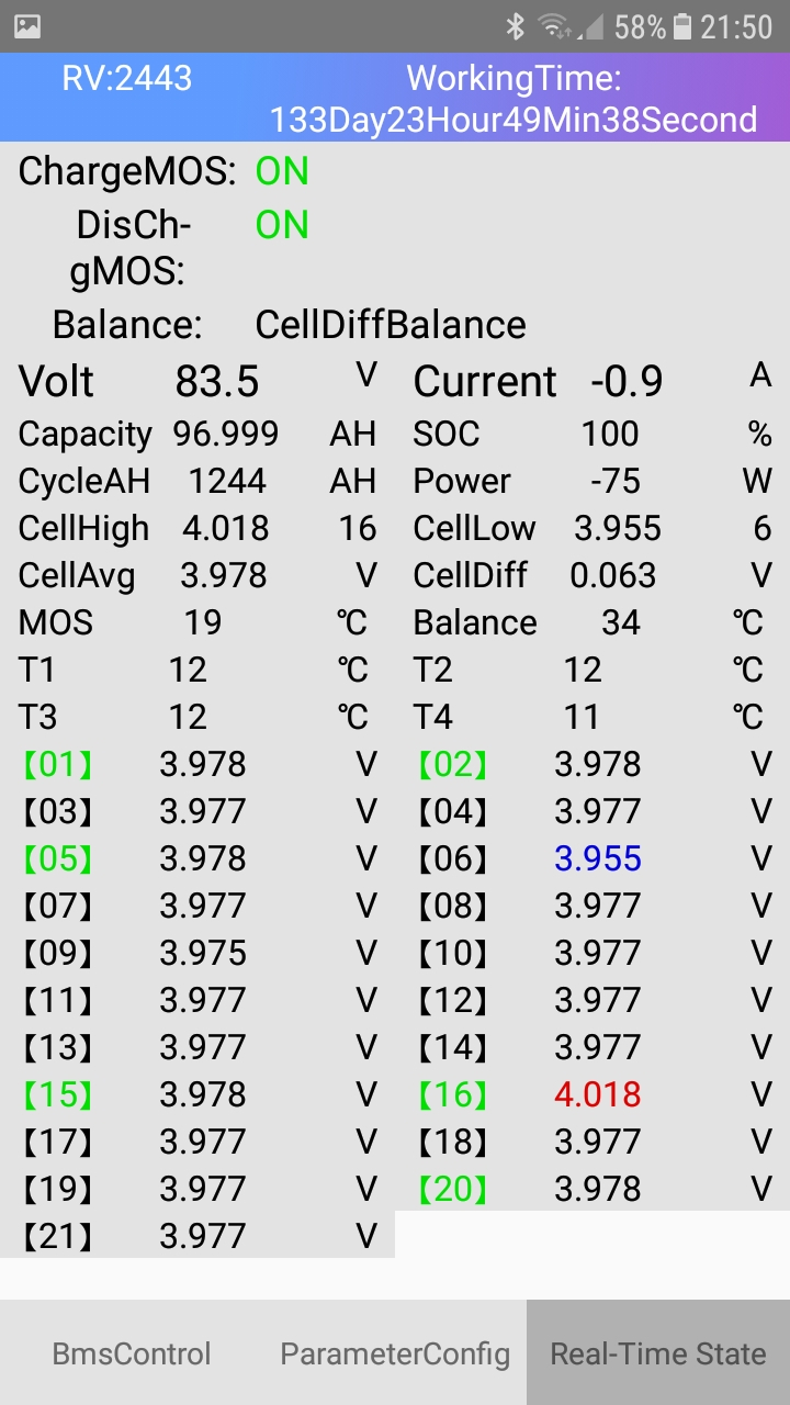Habe dann das Handy sichtbar am Roller angebracht. Nach etwa 400m Mofatempo bin ich dann, vor lauter aufs Display starren, durch ein Schlagloch gerumpelt und in den nächsten 20Sekunden stieg die Spannung der Zelle 16 beim fahren wieder auf 3,40V und ich konnte wieder mit richtig Leistung nach Hause fahren.