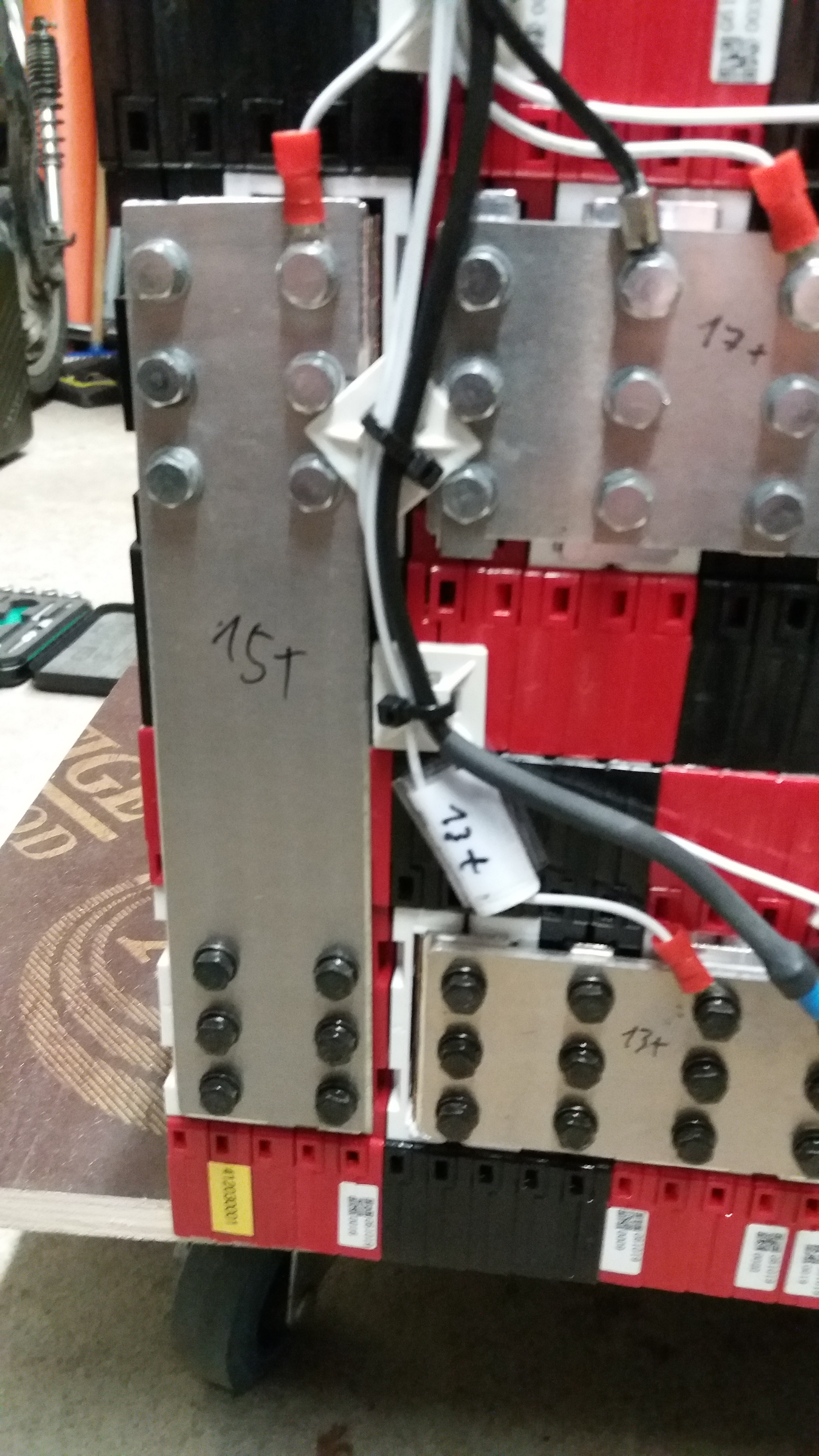Über zwanzig Ampere fließt da noch durch das Käbelchen, von daher fliegen die Alu-Teile raus und Kupfer-Verbinder kommen rein, 19 kurze habe ich noch, die langen muss ich dann erst noch machen. Zudem fliegen die schwarzen Schrauben raus, die leiten nicht. Hatte die vom angelieferten Zellpack übernommen ohne das zu prüfen. :o