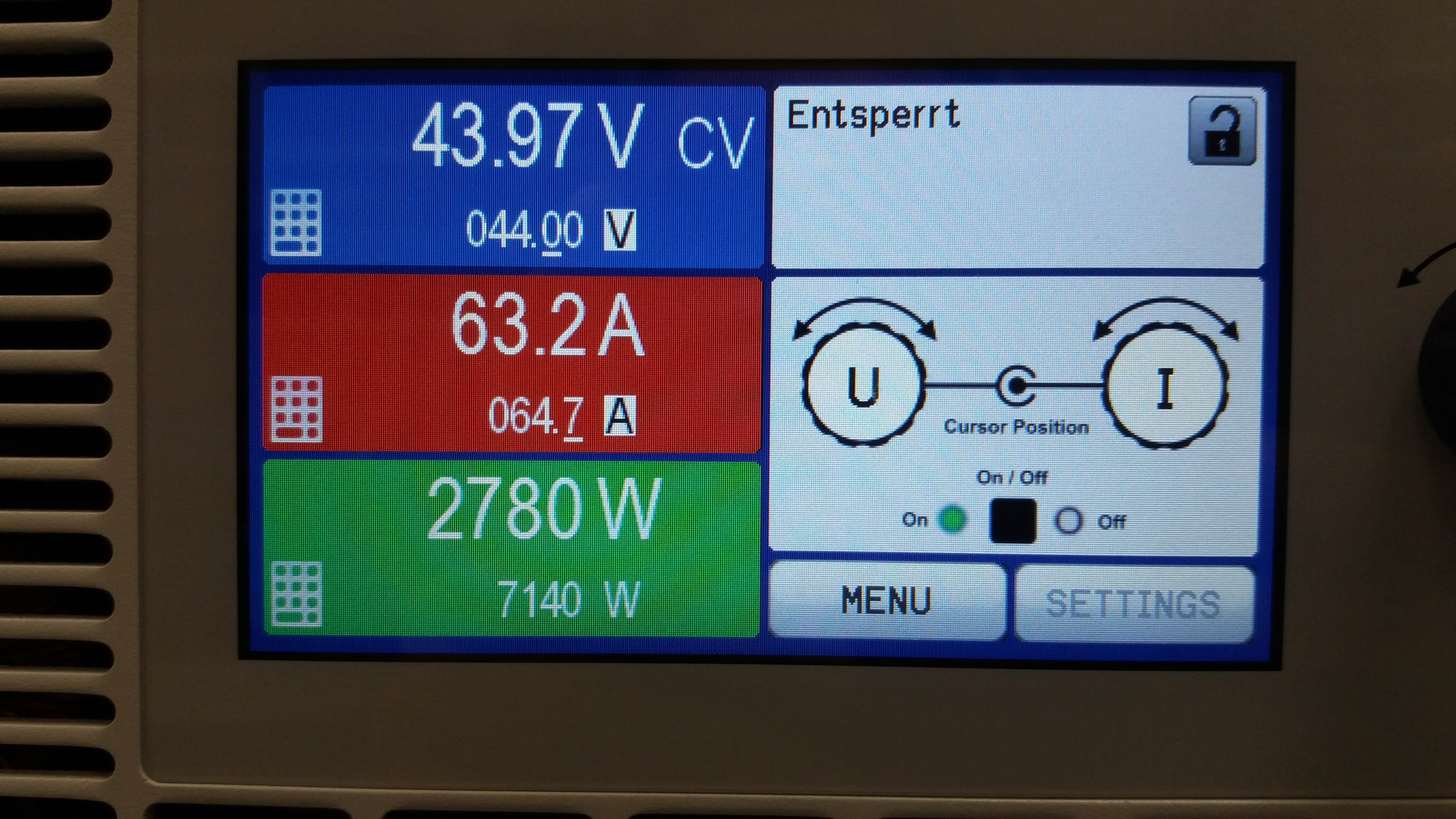 Anbei ein Bild der Leistungsmessung, eingestellt war es auf 45V , 1V Spannungsfall bei 63A auf der Zuleitung zur elektronischen Last war dabei zu verzeichnen, die Spannungsüberwachung (Sense Leitungen) des Elteks war nicht angeschlossen, sonst hätte das entsprechend auf 45V an der Last nachgeregelt.