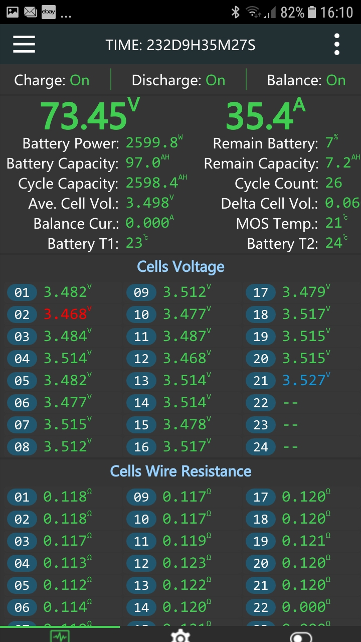Selbst bei 35A sieht man schon den höheren Widerstand und die daraus resultierende 10mV höhere Spannung durch die flexiblen Verbindungsleitungen von Zelle "11" und "21", im Vergleich zu den sonst vebauten 120mm² Kupferbrücken.