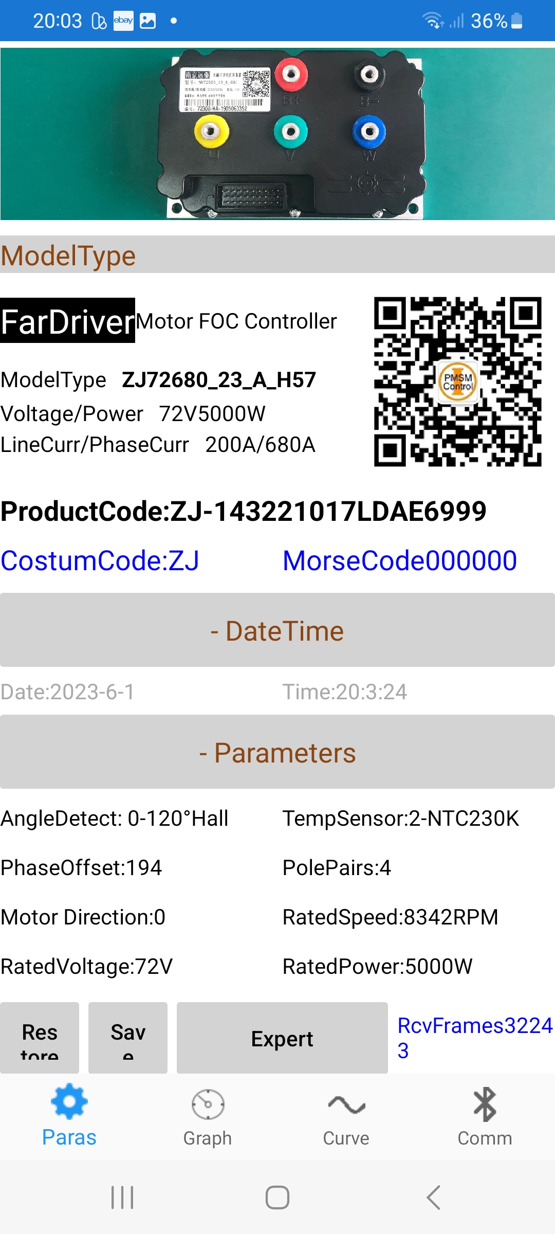 Der ND72680 hat eine neue App Version gebraucht 2.1 9 , mit der 1.5.5 baut er keine Verbindung auf und die 2.1.7 meldet "expired" abgelaufen. Nachdem ich von 350A auf 680A Phase hochdreht habe , hätte es beim Beschleunigen fast den Motorständer zerlegt. Er lässt bis zu 350ADC zu, ich habe ihn mal auf 200A für meinem Roller parametriert. Fie Spannungsmessung des Controllers stimmt übrigens exakt mit meinem.Multimeter und der des BMS überein.