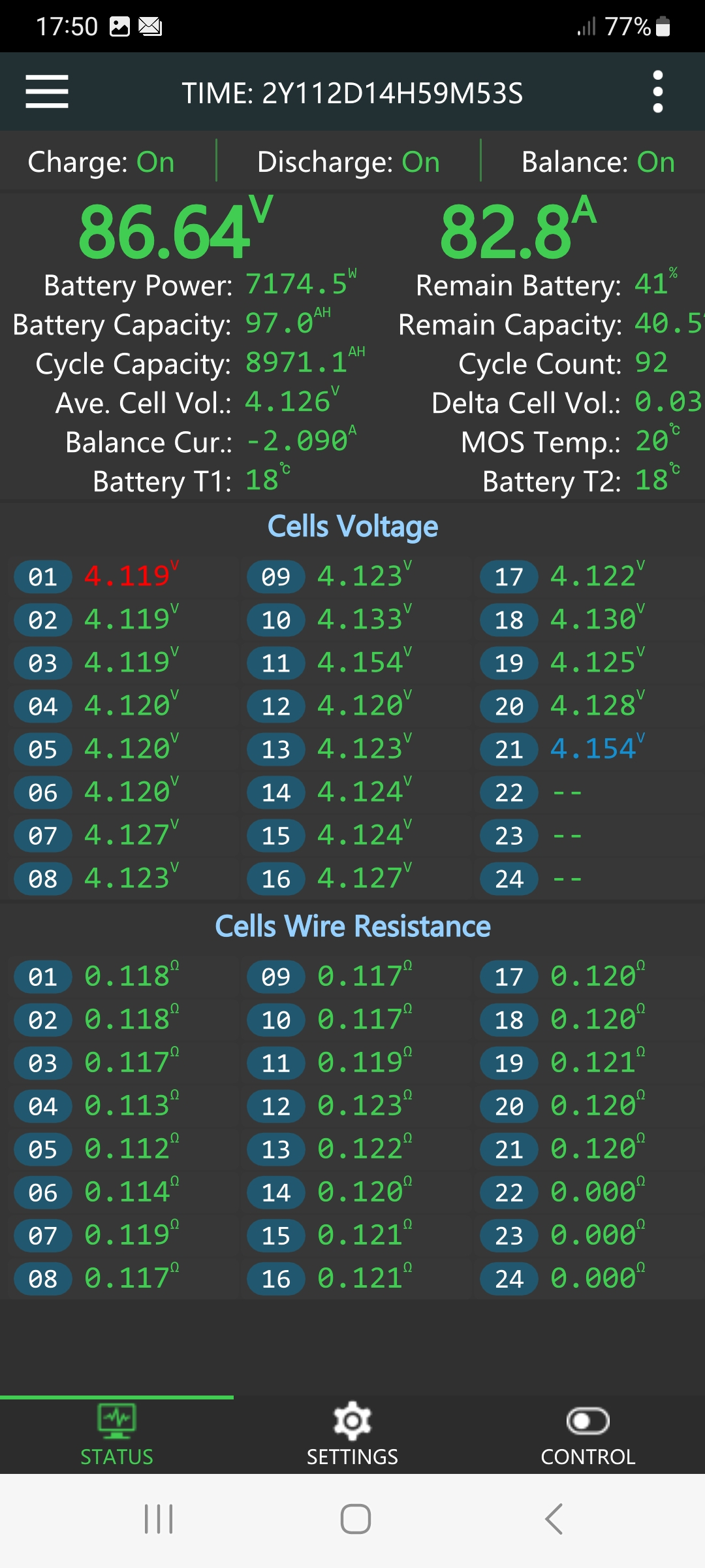 1-80A , 83-117V per Handy einstellbar, die beiden Geräte werden von einem ESP32 per CAN gesteuert, die Spannungsvorgabe von 44V pro Netzteil wird über ein Terminalprogramm von Handy per Bluetooth übertragen. Ich habe aber immer noch keinen Plan vom ESP programmieren, die Software stammt nicht von mir.