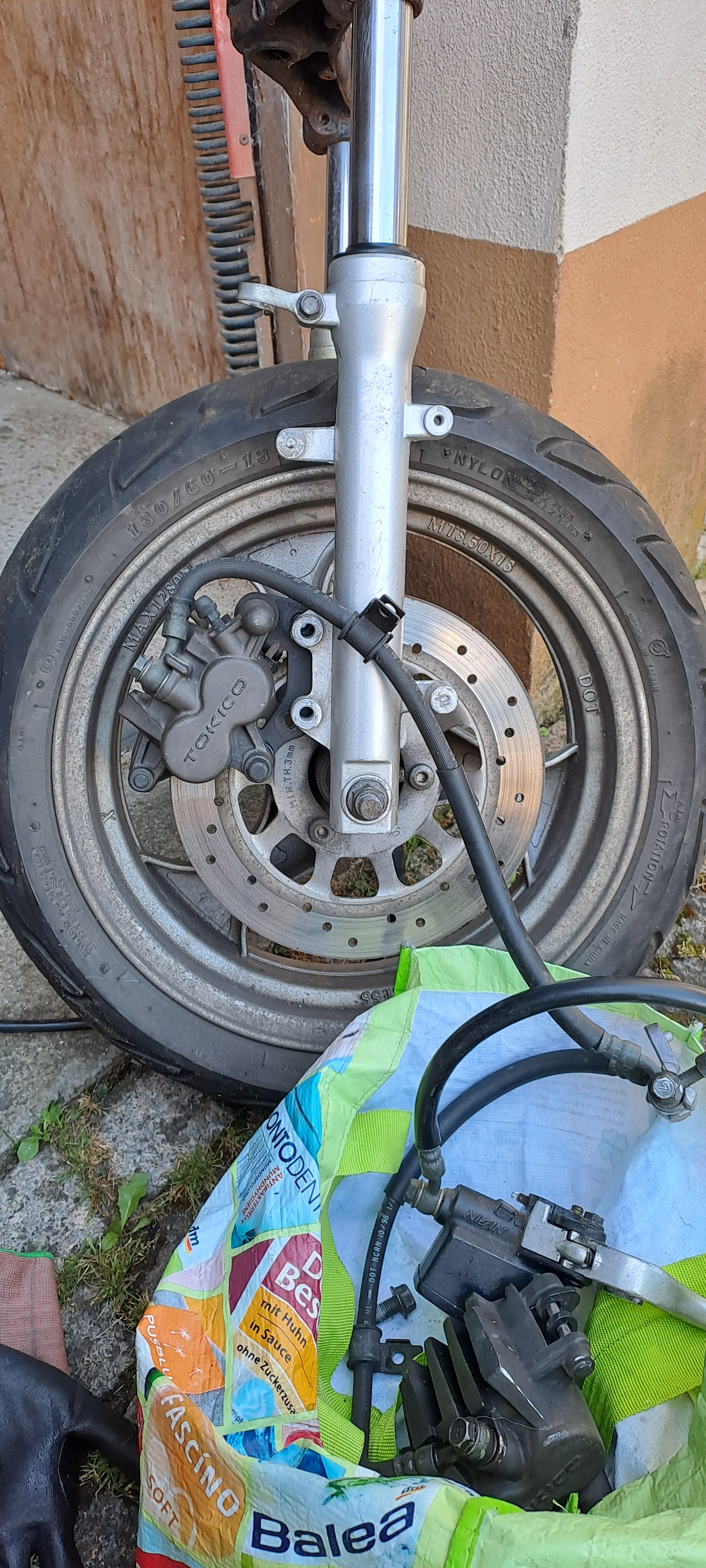 Die vom Kollegen geschenkte Tokico Bremse der SV650 passt zumindest vorne schon mal rein.