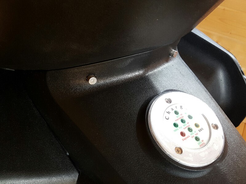 dcdc wandler aus dem kleinen fach verbannt und ein löchlein unter der sitzbank gemacht um zubdem bms-leds zu sehen