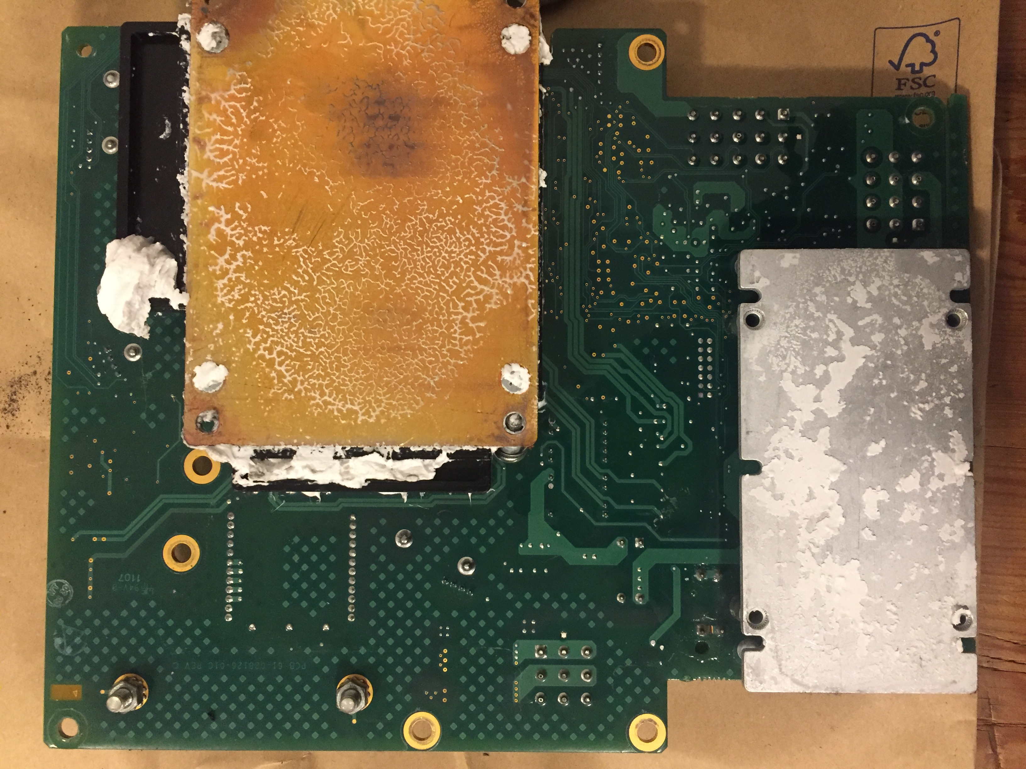 Die Wärmeleitpaste war wohl suboptimal verteilt/rausgequollen. Rechts das kleinere Modul ist übrigens der 12DC. Bei Vectrix ist wirklich alles anders gelöst.
