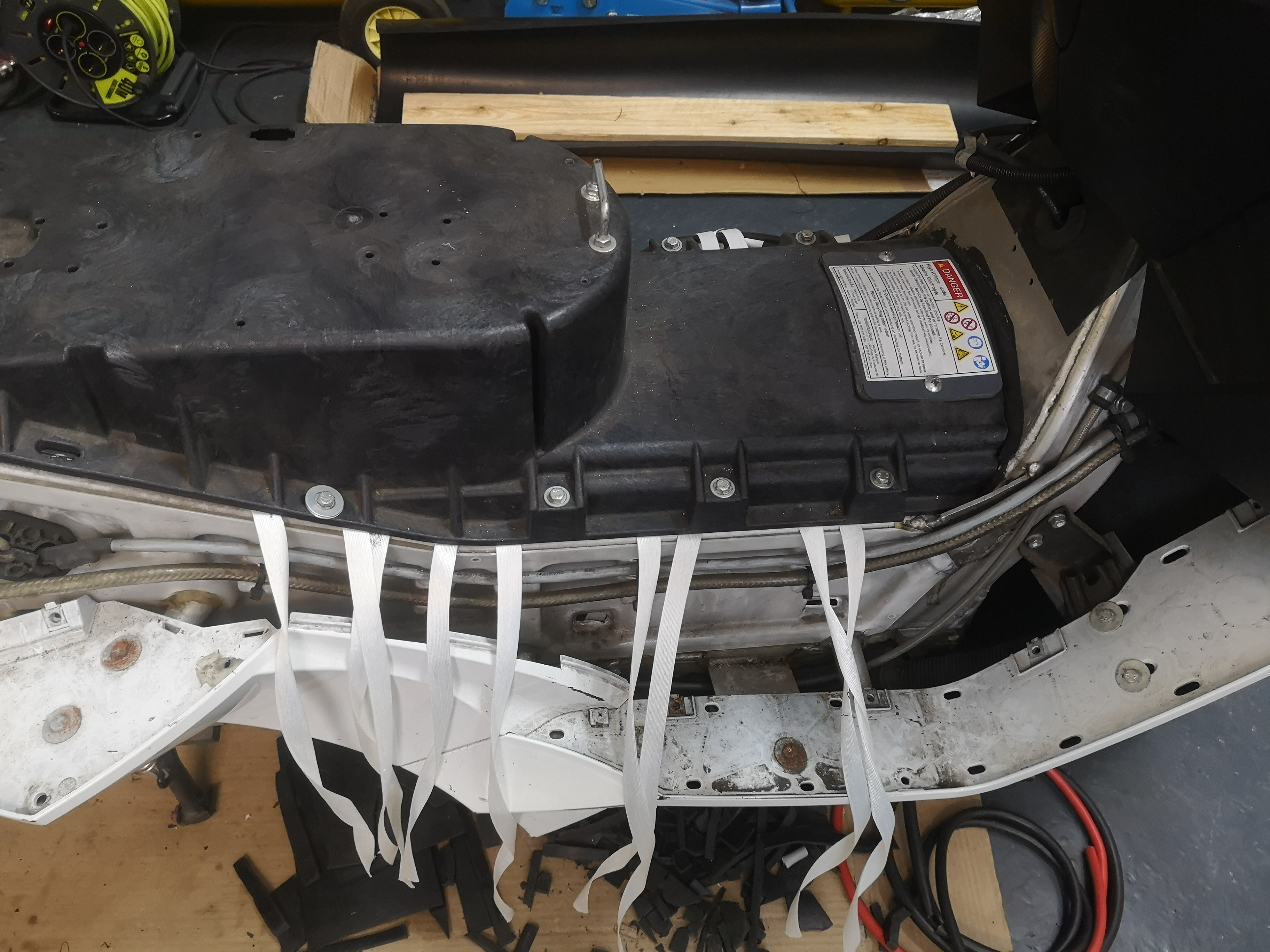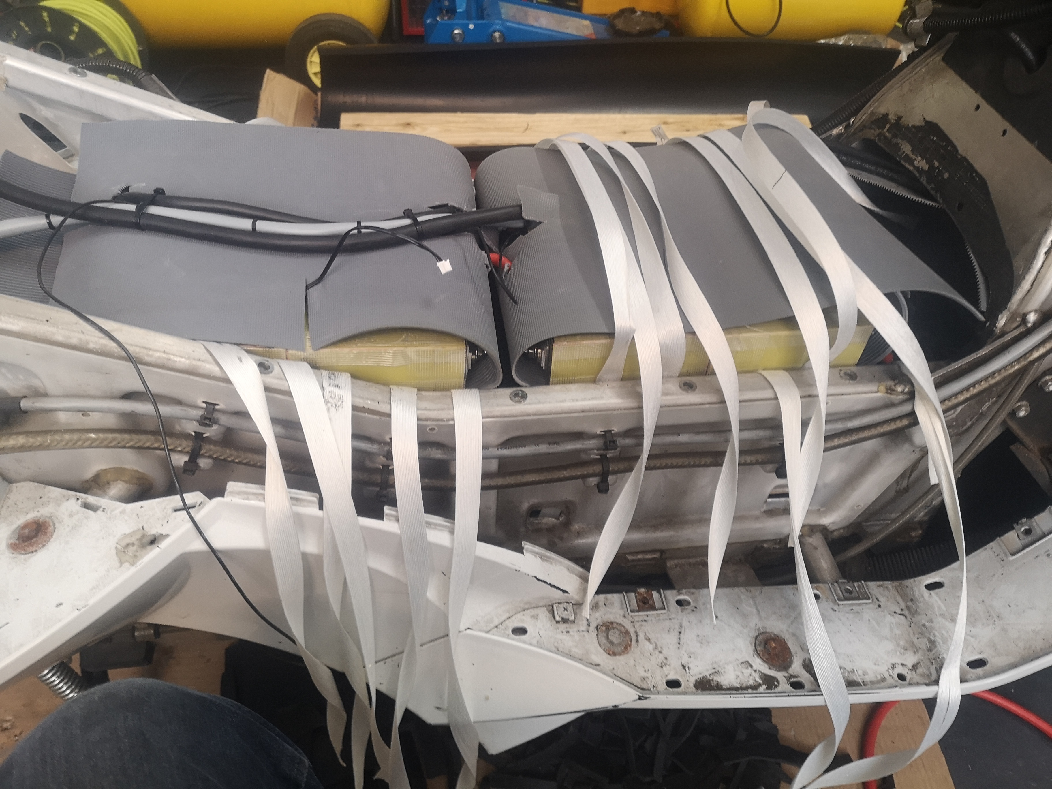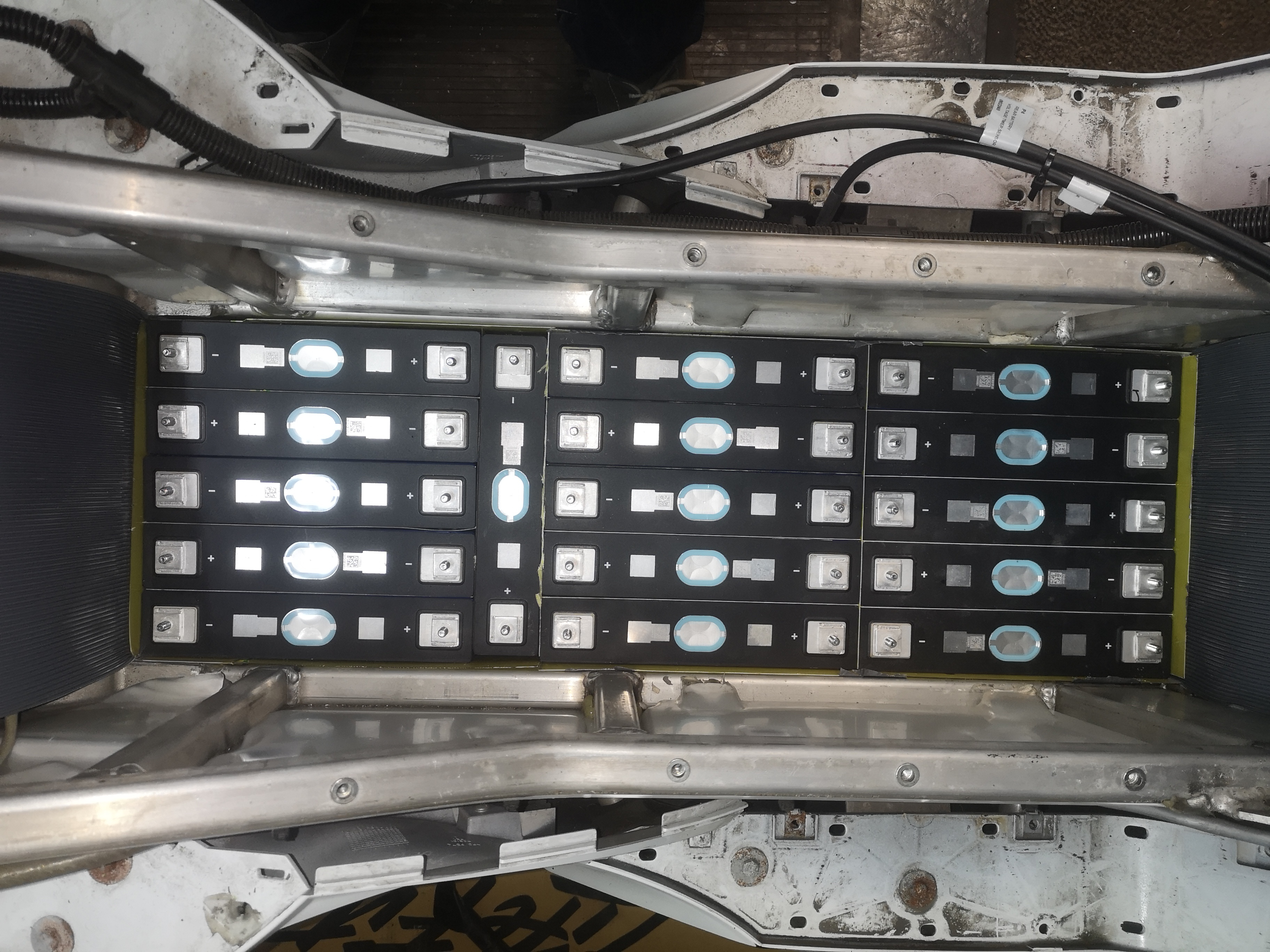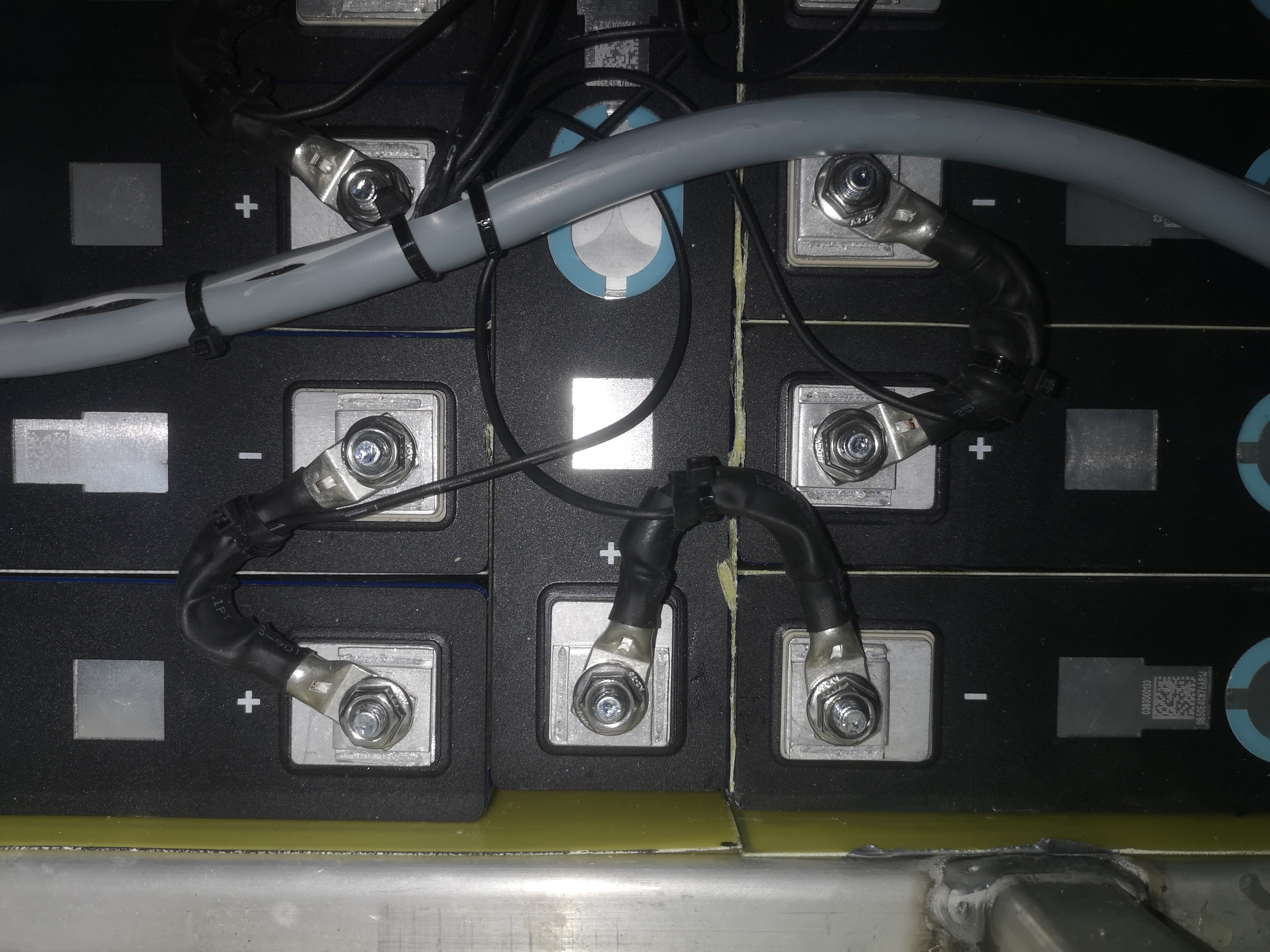 So, die ersten 1.000€ und gut 40kg sind verbaut. Die 175Ah-Zellen plus Isolator passen Millimeter-genau in das Akkufach, sodass ich auf ein zusätzliches Gehäuse verzichtet habe. Stabiler als der Vectrix-Rahmen wäre es sowieso nicht. Leider habe ich versäumt, Schlaufen unter einigen Zellen hindurch zu ziehen. Wenn die Zellen mal aufquellen, dürfte es mühselig werden, die wieder rauszuziehen.