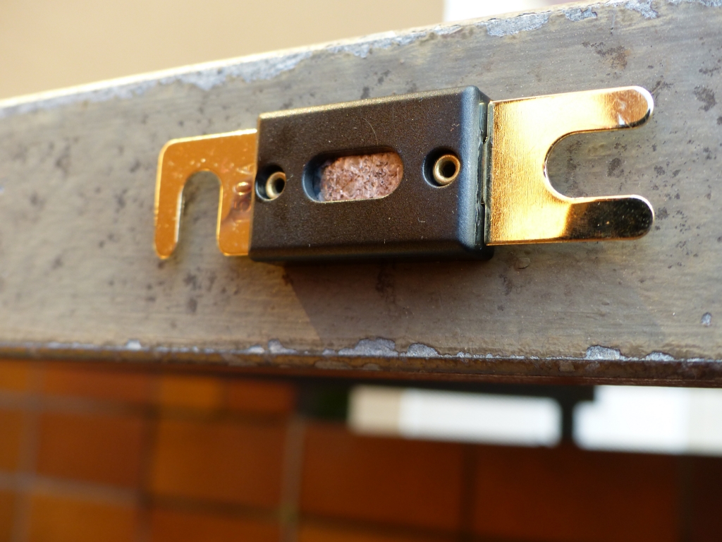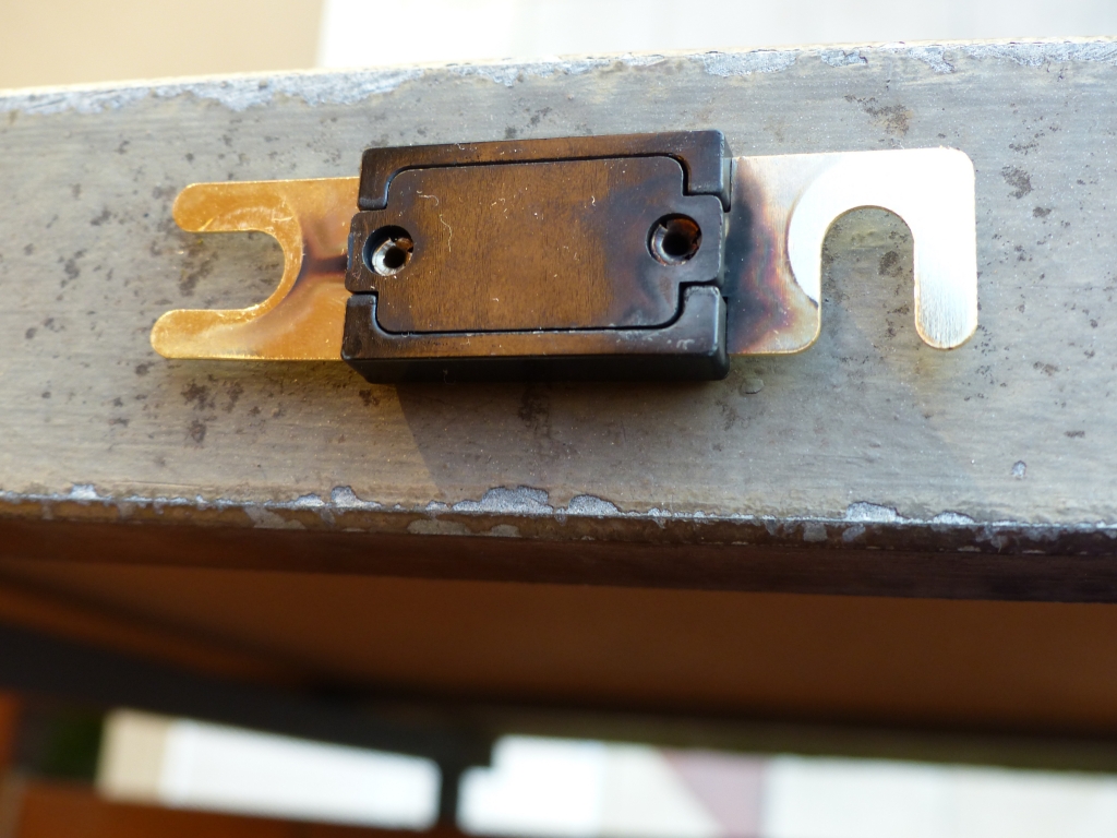 Zuerst noch zwei Bilder von der verdampften 150A ANL Sicherung vom verpolten Erstanschluss. Einmal von oben (in dem Fenster war mal ein vergoldeter Mäander..), einmal von unten mit deutlichen Schmauchspuren: Erst mal war viel fabrizieren dran: Den von Volker / VU18650PF (wo steckt er eigentlich? Hat schon sehr lange nichts mehr hier geschrieben...) vorgeschlagenen Kühlkörper