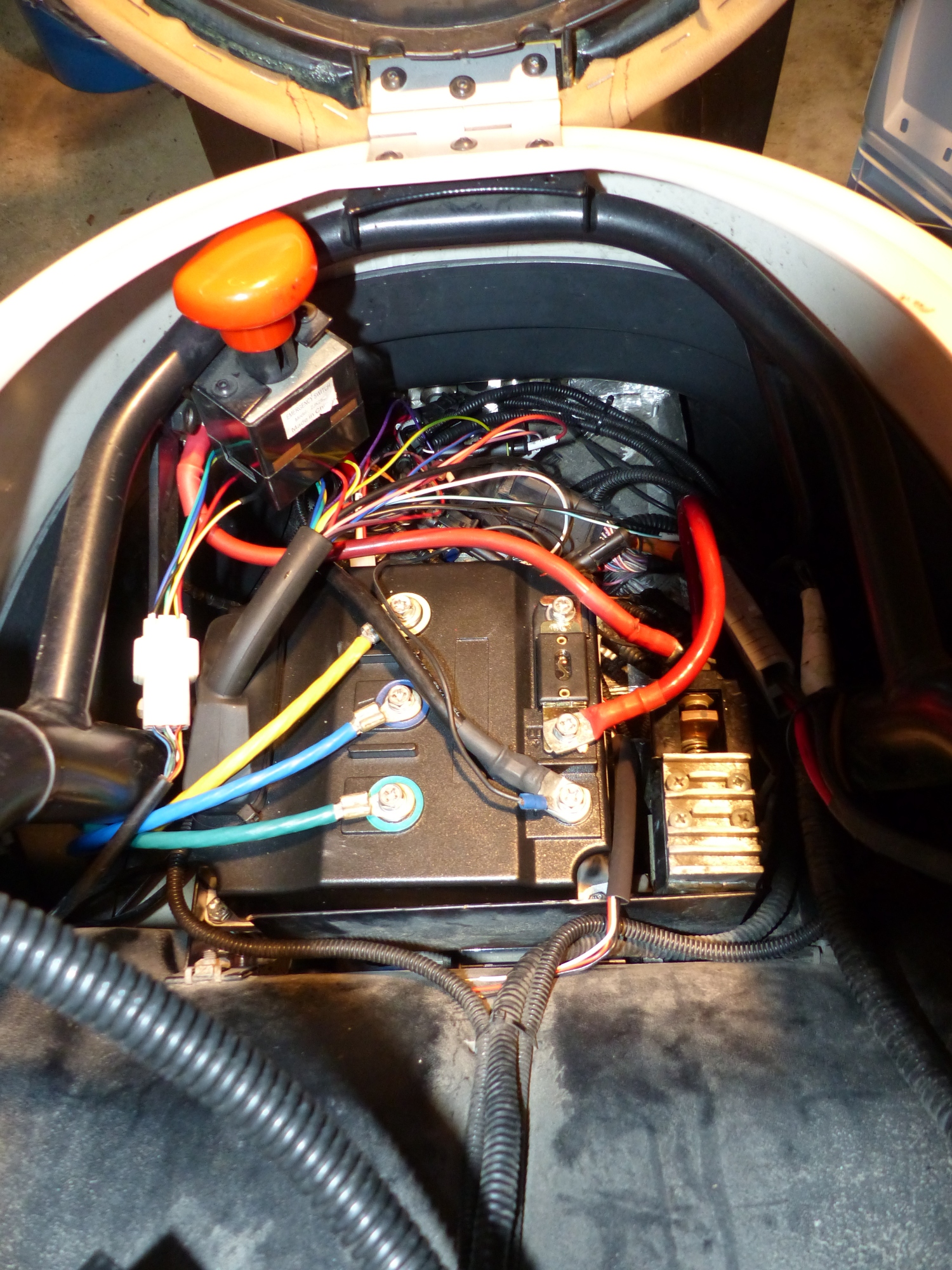 So sieht jetzt zumindest von hinten oben die Einbausituation des Controllers aus, mit noch frei herumhängender Verkabelung. Ich habe das alles natürlich hinterher mit Kabelbindern gut verzurrt: Nächster Schritt: Mäuschen spielen und gucken, was mit der Controllerverkabelung passiert, wenn das Helmfach von oben kommt.