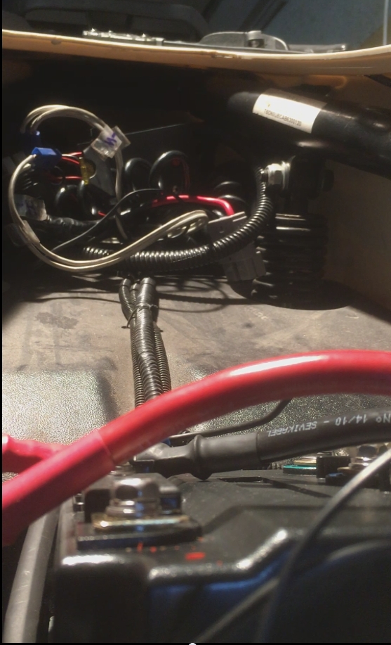 Also das Smartphone mit laufender Videokamera auf den Kabelverhau vor dem Controller gestellt, daneben eine LED-Taschenlampe für eine rudimentäre Beleuchtung. Vor Einfügen des Helmfachs sah das noch so aus: Mit auf dem dicken Pluskabel (25mm²) vom Not-Aus-Knopf zum Schütz lose aufliegendem Helmfach (noch der gleiche schöne Bogen, nur dunkler alles): Und dann habe ich das Helmfach runtergedrückt, bis es auf dem oberen Rand auflag - Autsch!!! Also Heißluftpistole auf 400°C und die Vorderkante vom Helmfach schön warm und geschmeidig gemacht, von außen und innen, und dann kräftig runtergedrückt. Jetzt sieht es vorn konkav statt konvex aus und verquetscht nichts mehr darunter