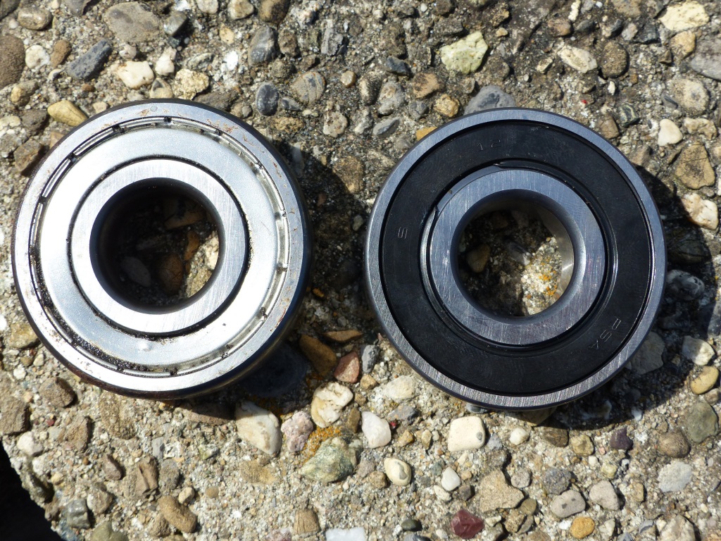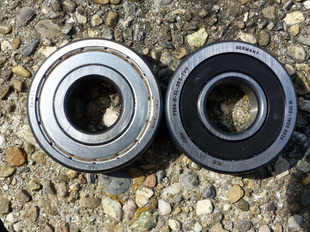 Und hier ist rechts die Druckseite des neuen Schrägkugellagers zu sehen, was am normal großen Innenring und schmalerem Außenring zu erkennen ist: