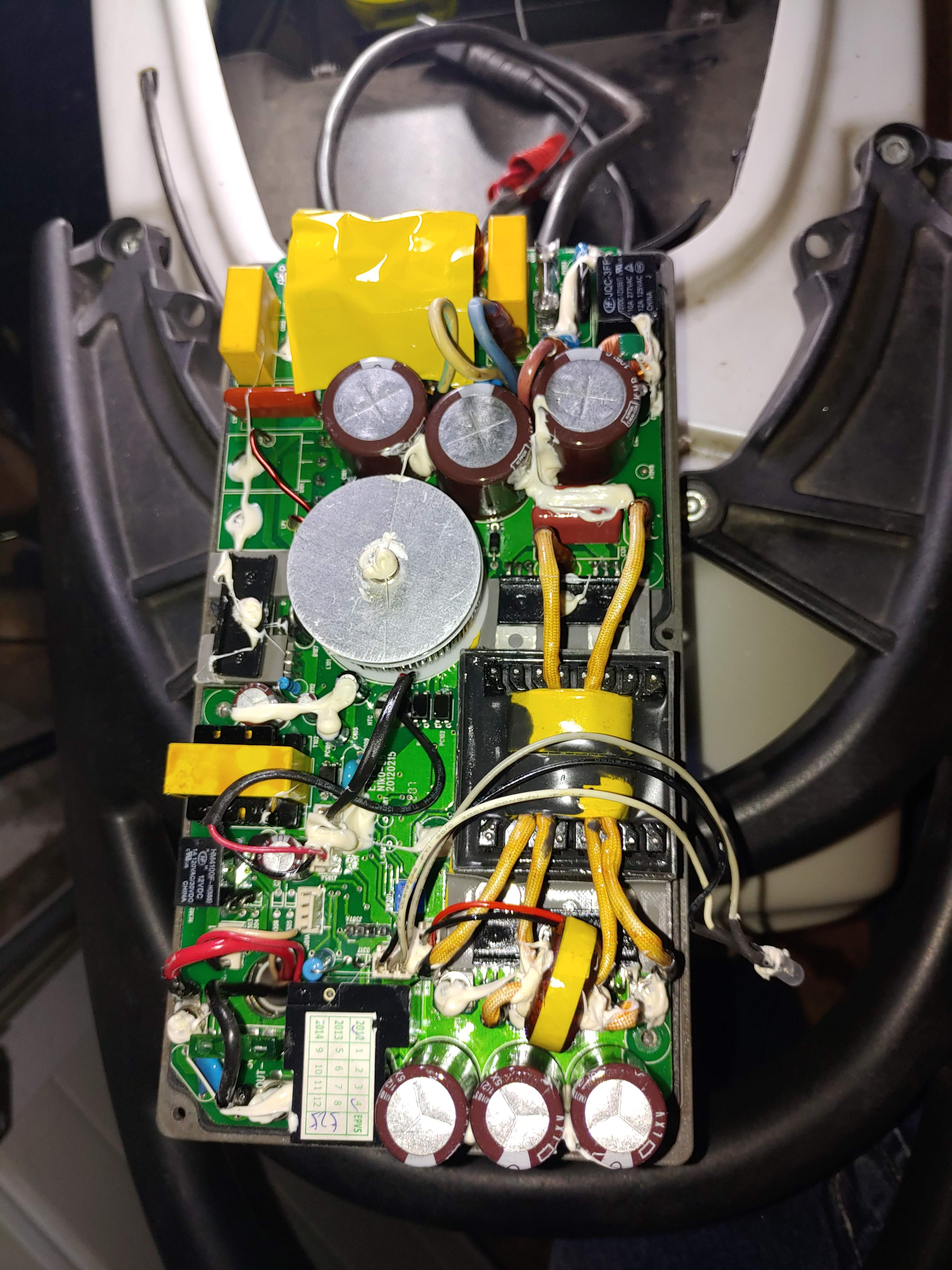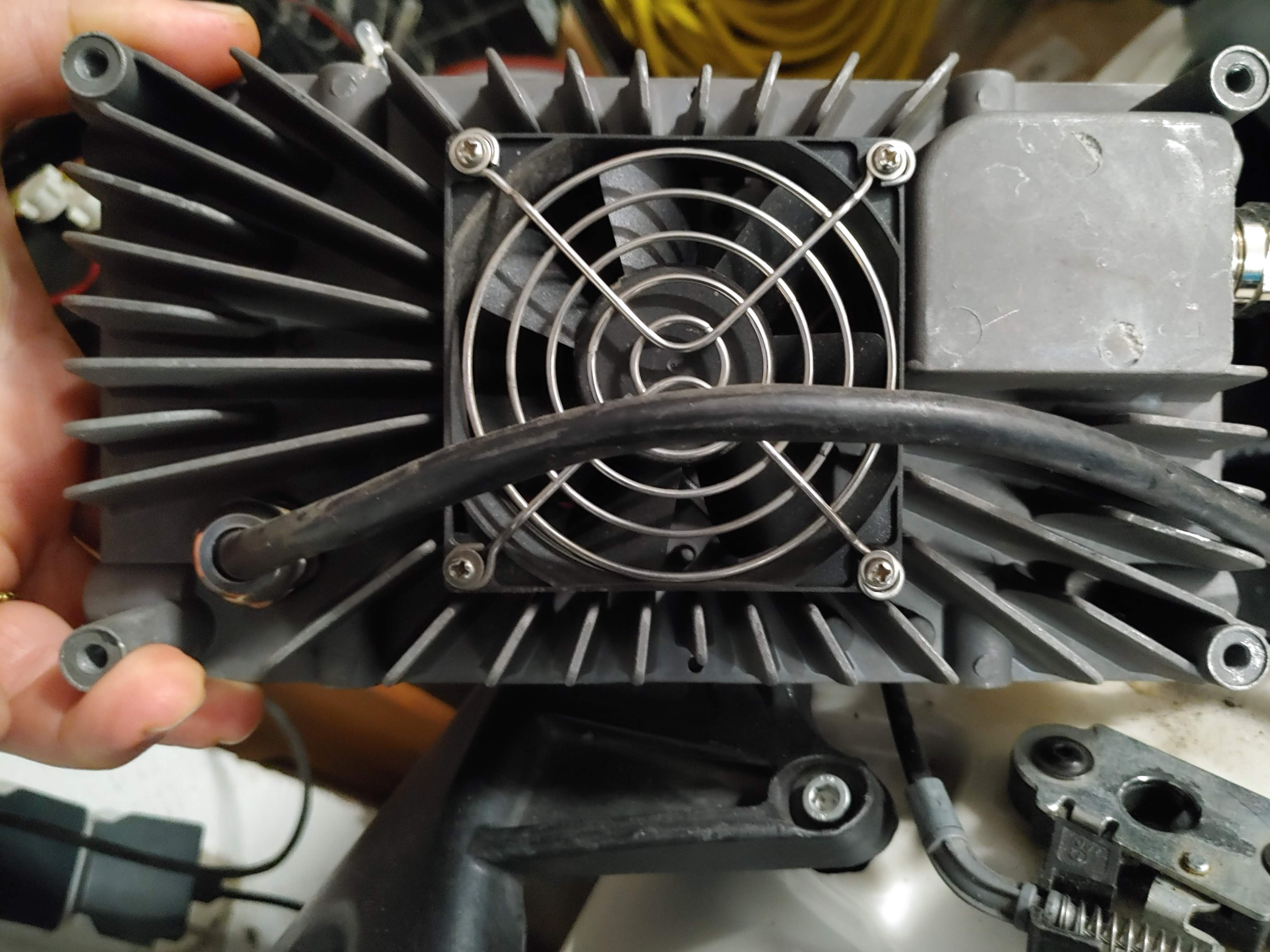 Hallo, danke für die Antwort, mein Ladegerät schaut etwas anders aus, hat außerdem einen Lüfter: Das Gerät war tatsächlich über dem Motor, auf der Blechplatte angeschraubt.MEroller hat geschrieben: ↑Sa 13. Feb 2021, 12:32Schwer zu sagen, wie und ob sich da eine Reparatur lohnt. Das Ding dürfte sich selbst zu Tode kochen beim laden. Ich hatte einen geregelten PC Lüfter draufgeschraubt, was ihn selten hat über 40°C kommen lassen: