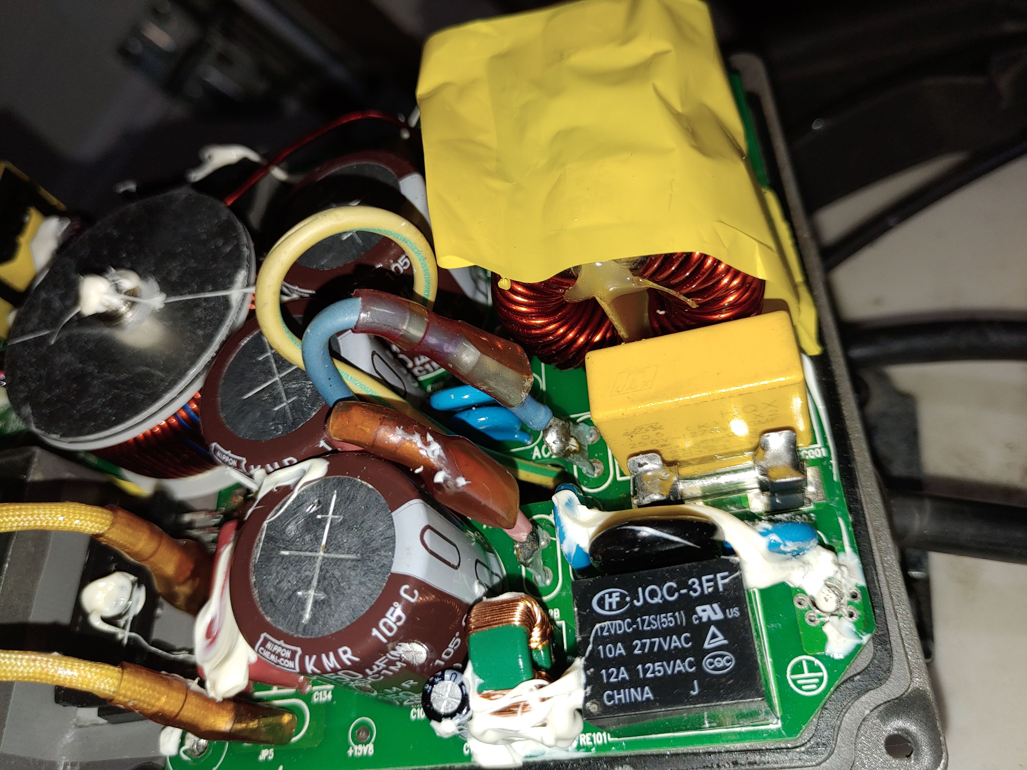 Der Kaltgerätestecker war schon vor Jahren schon leicht abgescheuert, den hatte behelfsmäßig umwickelt, so dass ich hier zuallererst schauen wollten. Nun, nach dem Ausbau und Öffnen des Ladegeräts sehe ich ein, dass ich hier kaum an die Anschlüsse komme. Die Elemente der Platine auf den Kühlkörper geklebt, und der Anschluss drunter.