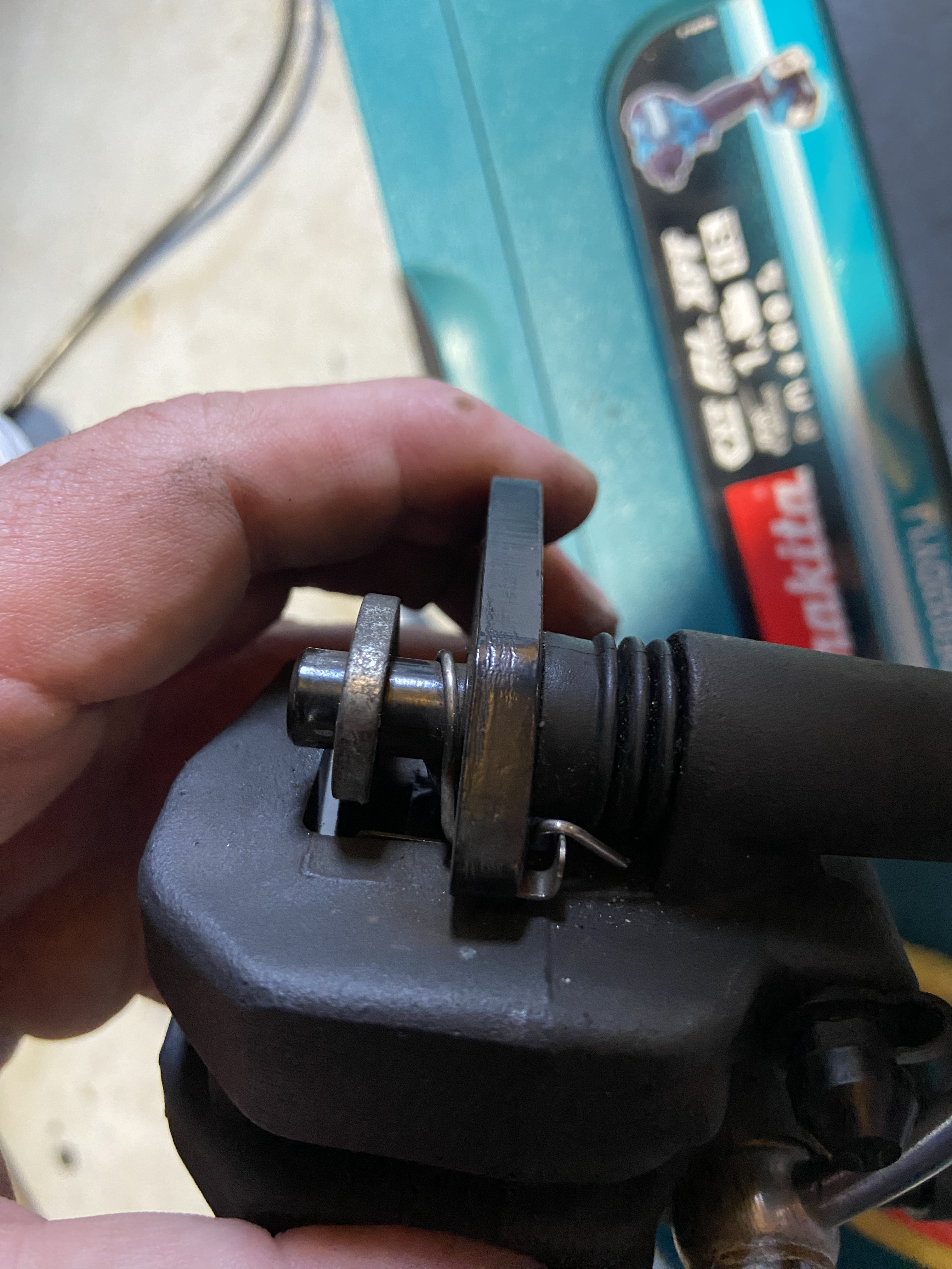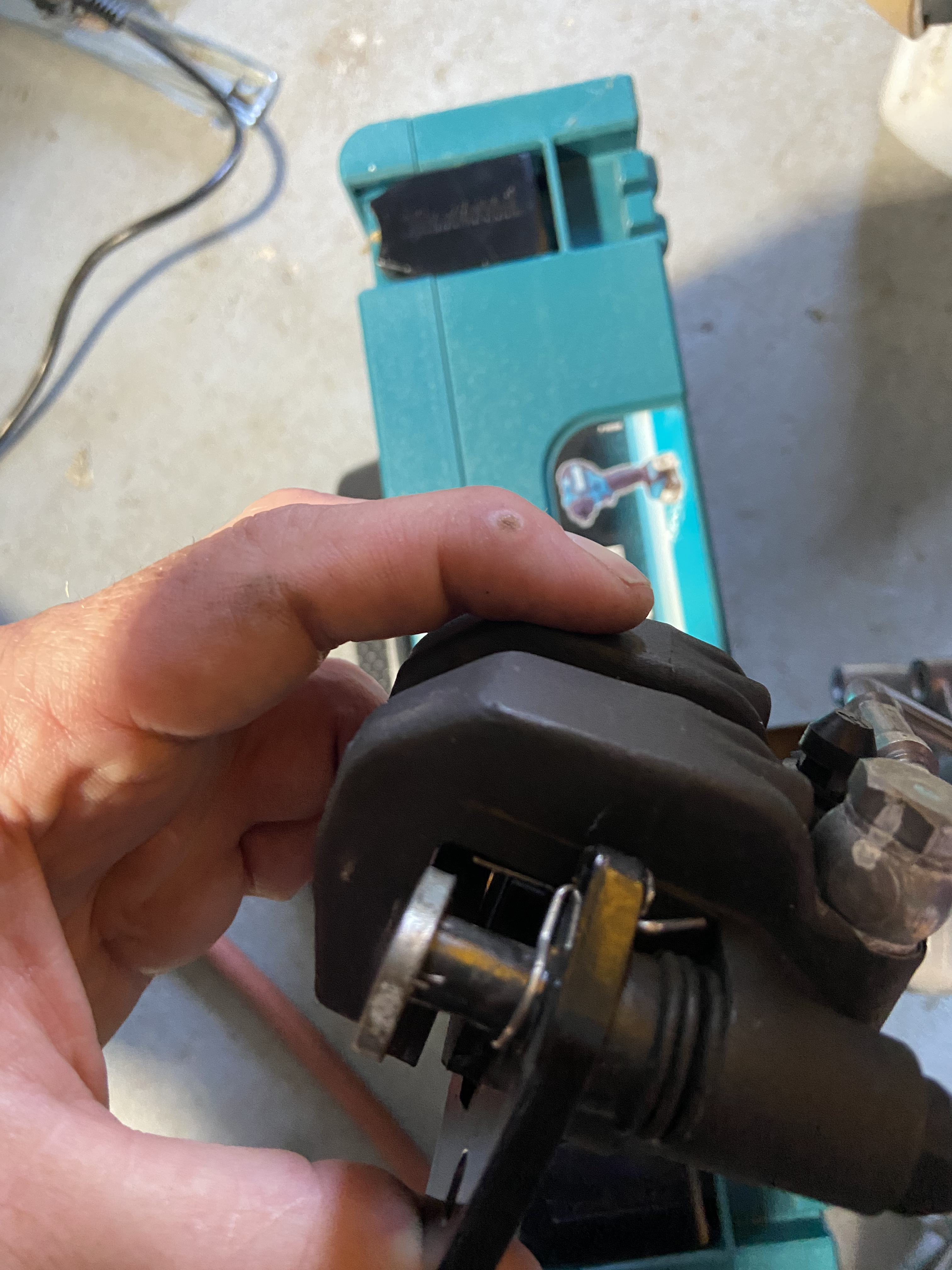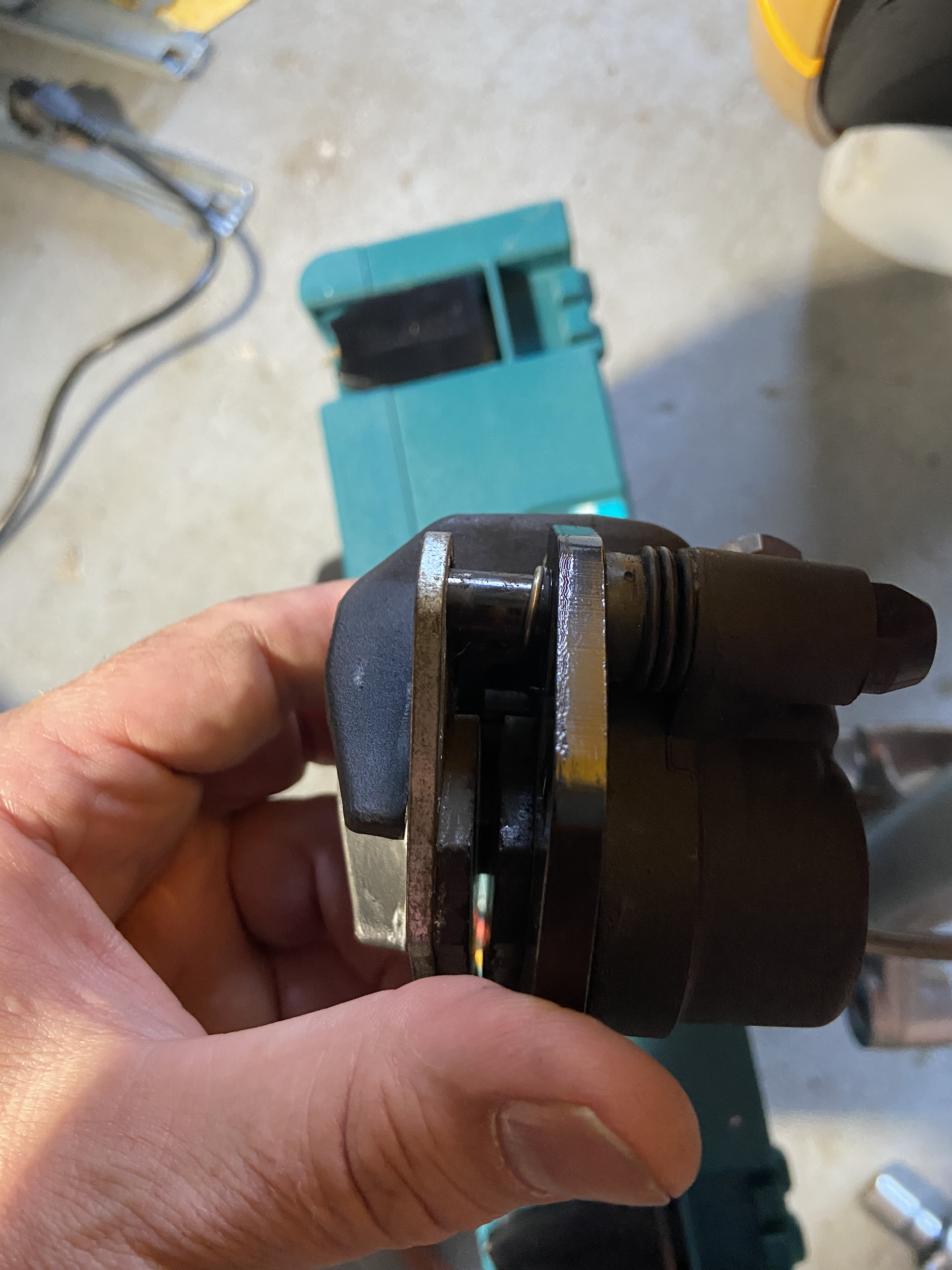 bei der man erst die Feder und den kleineren Belag, der vom Kolben bewegt wird, herausnehmen muss, bevor der Belag mit den beiden Halteaugen so gekippt werden kann, dass er auch raus geht.