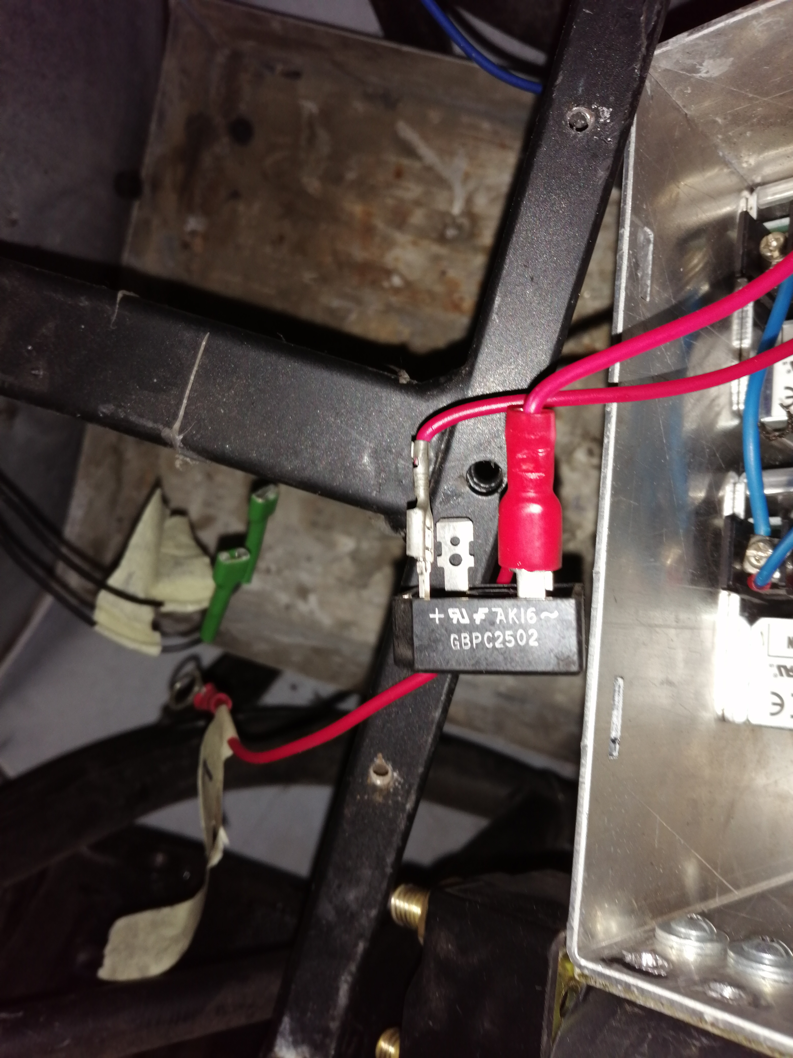 Ein rotes dünnes Kabel ist auf der Schaltseite des Relais angebaut, wo auch der Pluspol der Batterien dran ist und verschwindet unter der Lenkradverkleidung direkt daneben kommt ein gleich dickes schwarzes Kabel aus aus der Verkleidung und geht zum Spannungsplusausgang des Ladegerätes.... Ich vermute, dass das so am Zündschloss angebracht ist, dass bei eingeschaltetem Controller die Verbindung zwischen Ladegerät und Akku unterbrochen ist??? Wenn das so ist, kann ich das weglassen, da ja der neue Akku einen getrennten Ein-/Ausgang hat?! Dann ist da noch ein Teil, wovon ich ein Foto angehängt habe.... Scheint ein Brückengleichrichter zu sein... Aber welche Funktion? Wechselspannung sollte doch hier nicht auftreten?!... Oder soll er das Ladegerät vom Akku trennen, weil die Dioden nur Strom in eine Richtung durchlassen. Also Ladegerät Richtung Akku ja... Akku Richtung Ladegerät nein????