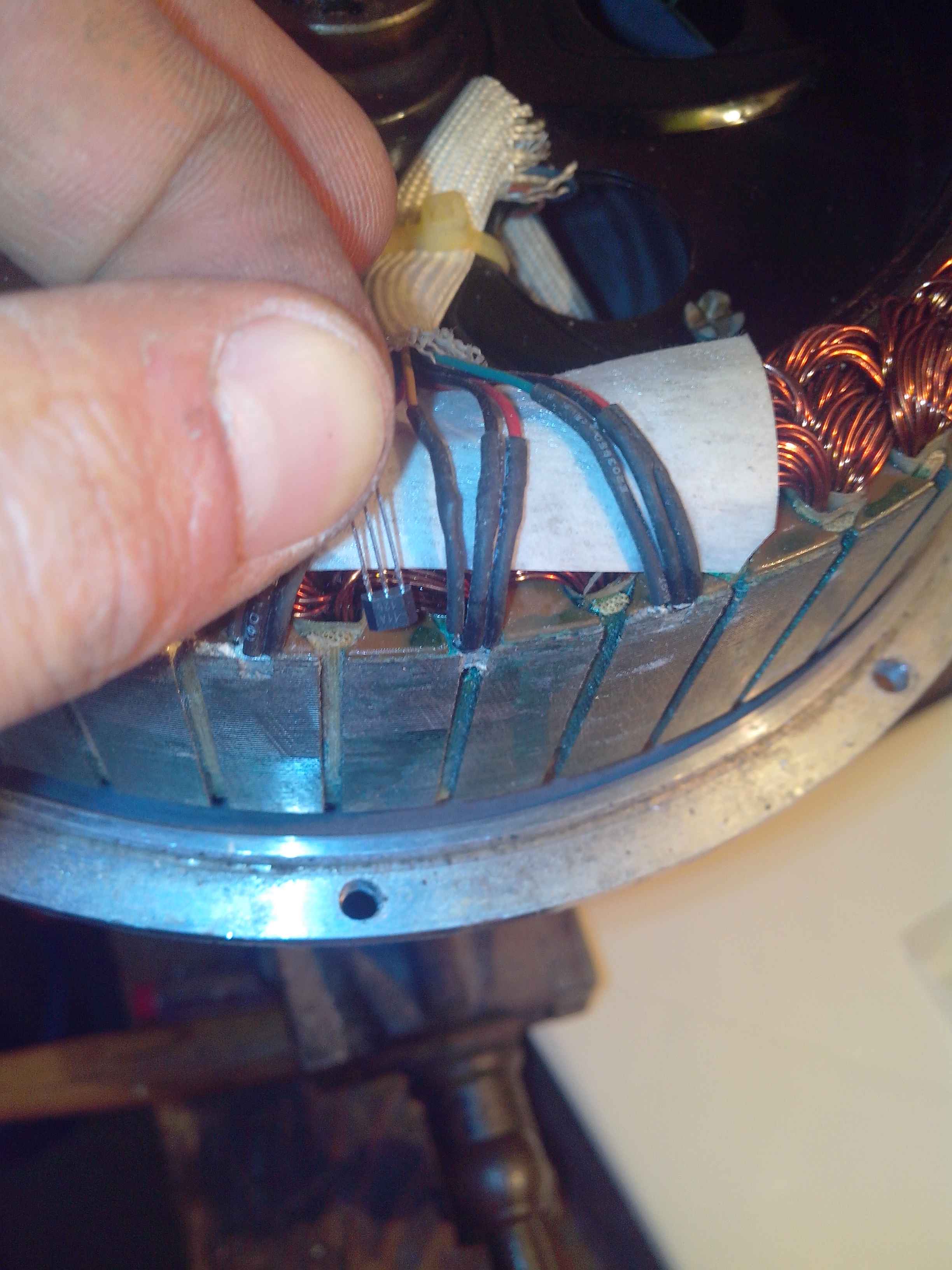 Du siehst auf der Platine 3x 3 Lötpunkte, an denen die Hallsensoren hängen. Mindestens den defekten wechseln, sauber auslöten, und neuen einlöten. Wahrscheinlich ist die Platine mitsamt der Sensoren an den Spulen verklebt. Beim Lösen der Verklebung darauf achten, dass der Kupferlackdraht nicht beschädigt wird, ebenso beim Wiedereinbau darauf achten, dass es keine Kurzschlüsse gibt, also wieder ähnlich isolieren wie es jetzt ist.