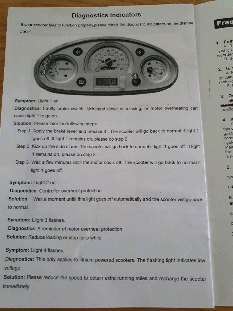 Die linke Anzeige mit Diagnosis draufstehen hat links wohl ein grobe Batteriestandsanzeige, und die Diagnose sind die zwei LEDs rechts im Instrument. Die könnten wohl verschiedenes anzeigen, z.B. ob der Seitenständer ausgeklappt ist und deswegen die Karre nicht fahren will, oder die Batterie langsam zur Neige geht, oder dass geladen wird, oder oder oder...